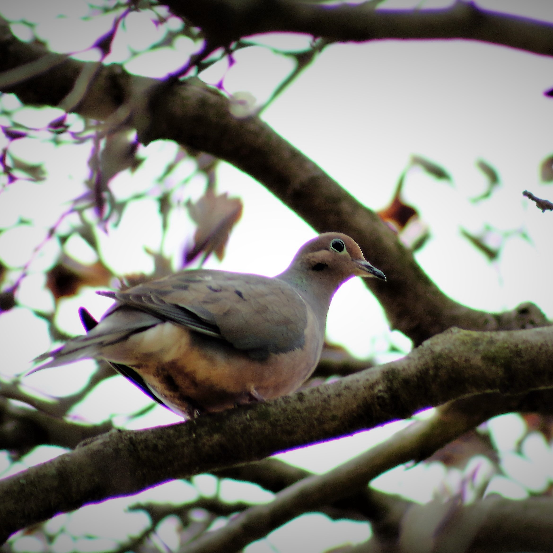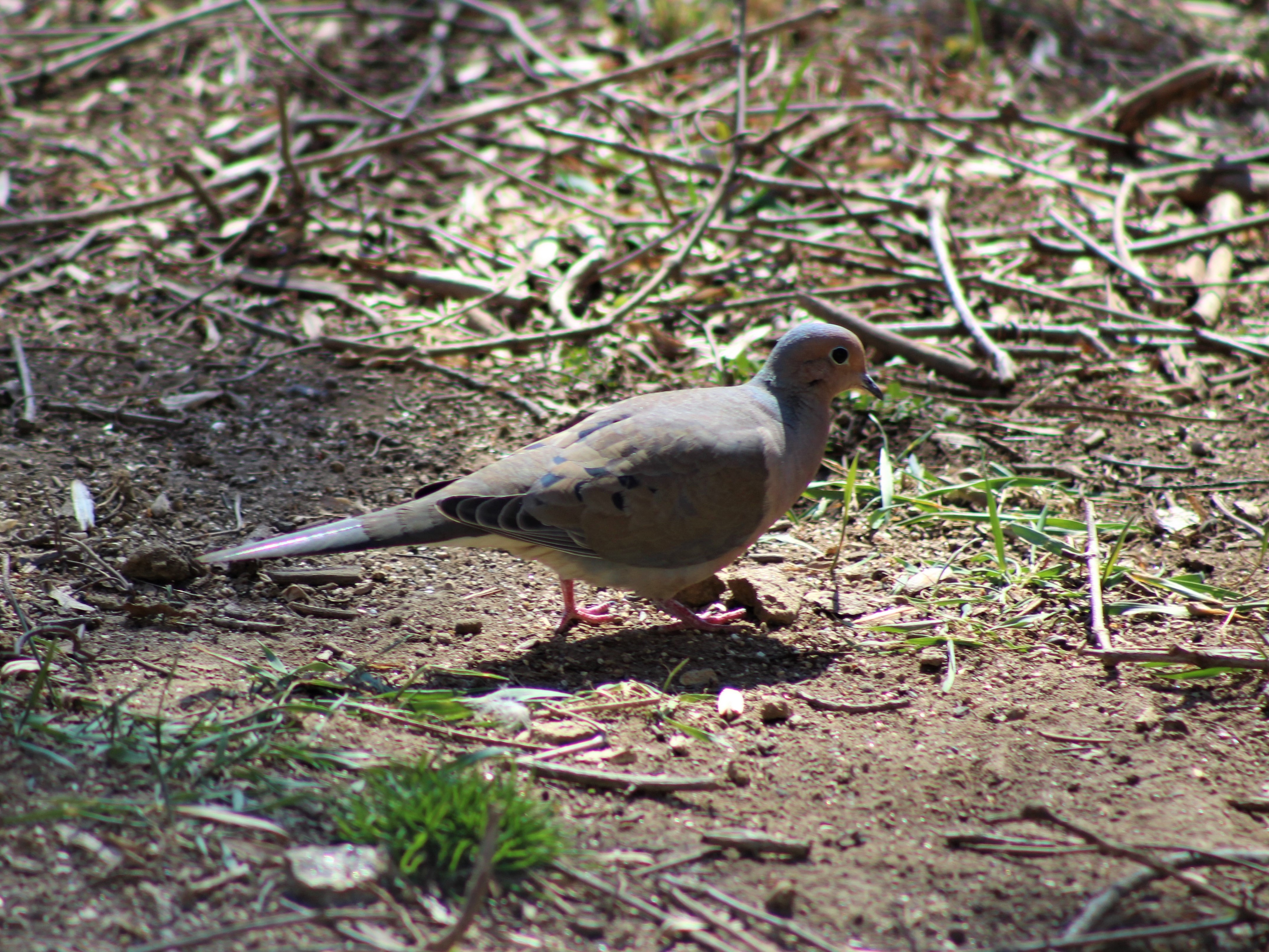 A graceful, slender-tailed, small-headed dove that’s common across the continent. Mourning Doves perch on telephone wires and forage for seeds on the ground; their flight is fast and bullet straight. Their soft, drawn-out calls sound like laments. When taking off, their wings make a sharp whistling or whinnying. Mourning Doves are the most frequently hunted species in North America. [All About Birds]