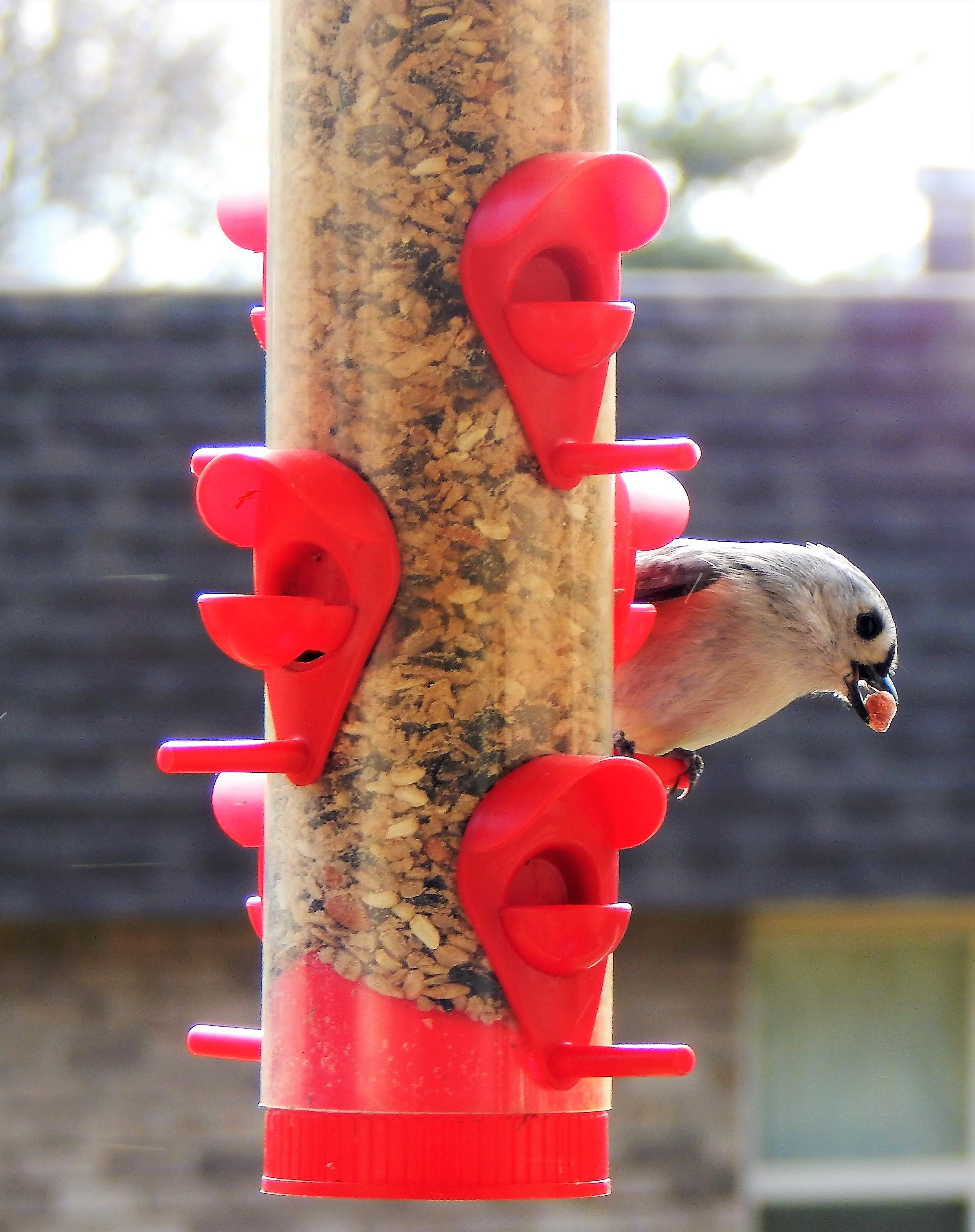 - Tufted Titmice hoard food in fall and winter, a behavior they share with many of their relatives, including the chickadees and tits. Titmice take advantage of a bird feeder’s bounty by storing many of the seeds they get. Usually, the storage sites are within 130 feet of the feeder. The birds take only one seed per trip and usually shell the seeds before hiding them.