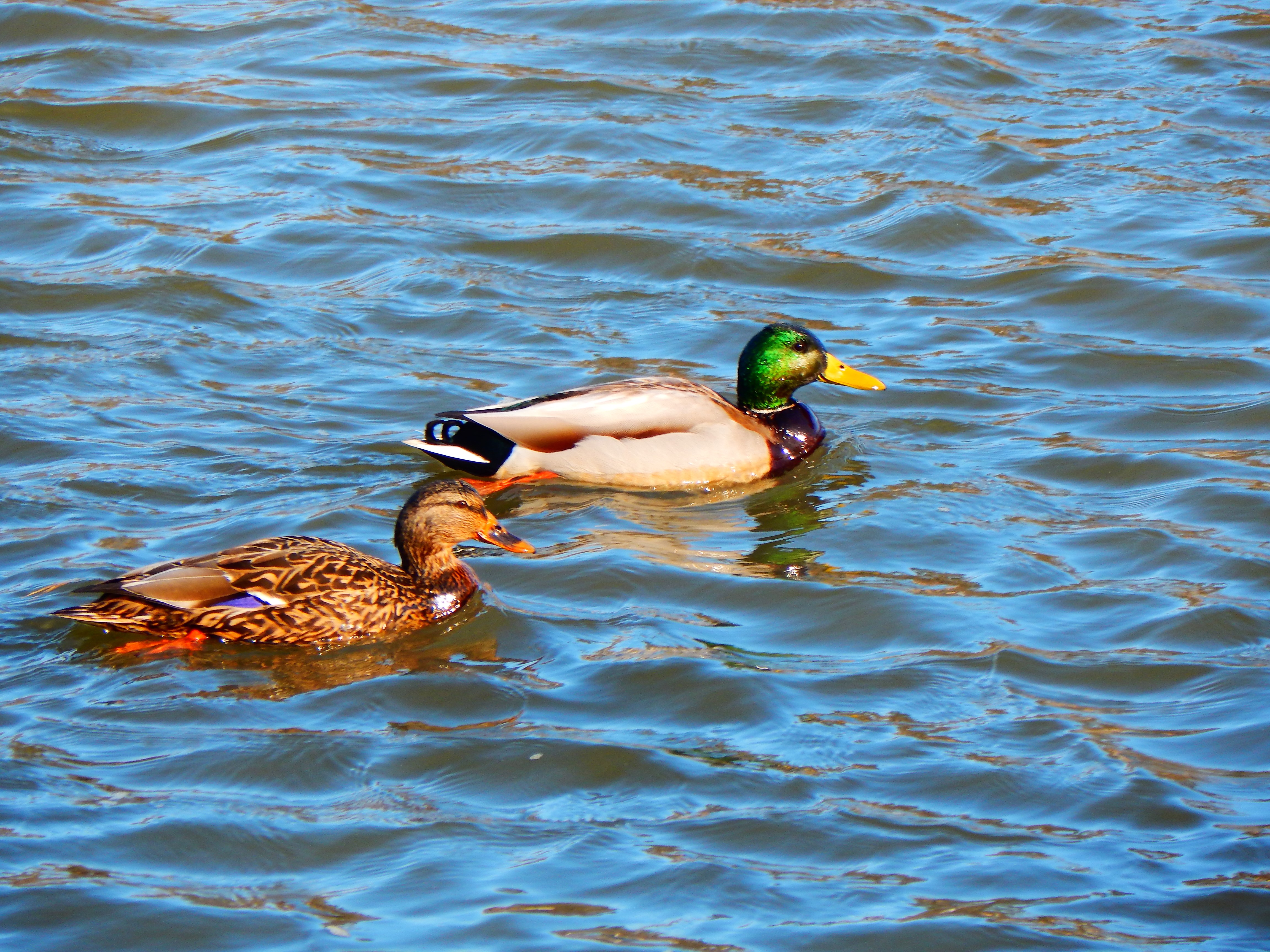 The male birds (drakes) have a glossy green head and are gray on wings and belly, while the females (hens or ducks) have mainly brown-speckled plumage. Both sexes have an area of white-bordered black speculum feathers which commonly also include iridescent blue feathers, especially among males. Mallards live in wetlands, eat water plants and small animals, and are social animals preferring to congregate in groups or flocks of varying sizes. This species is the main ancestor of most breeds of domesticated ducks. [Wikipedia]