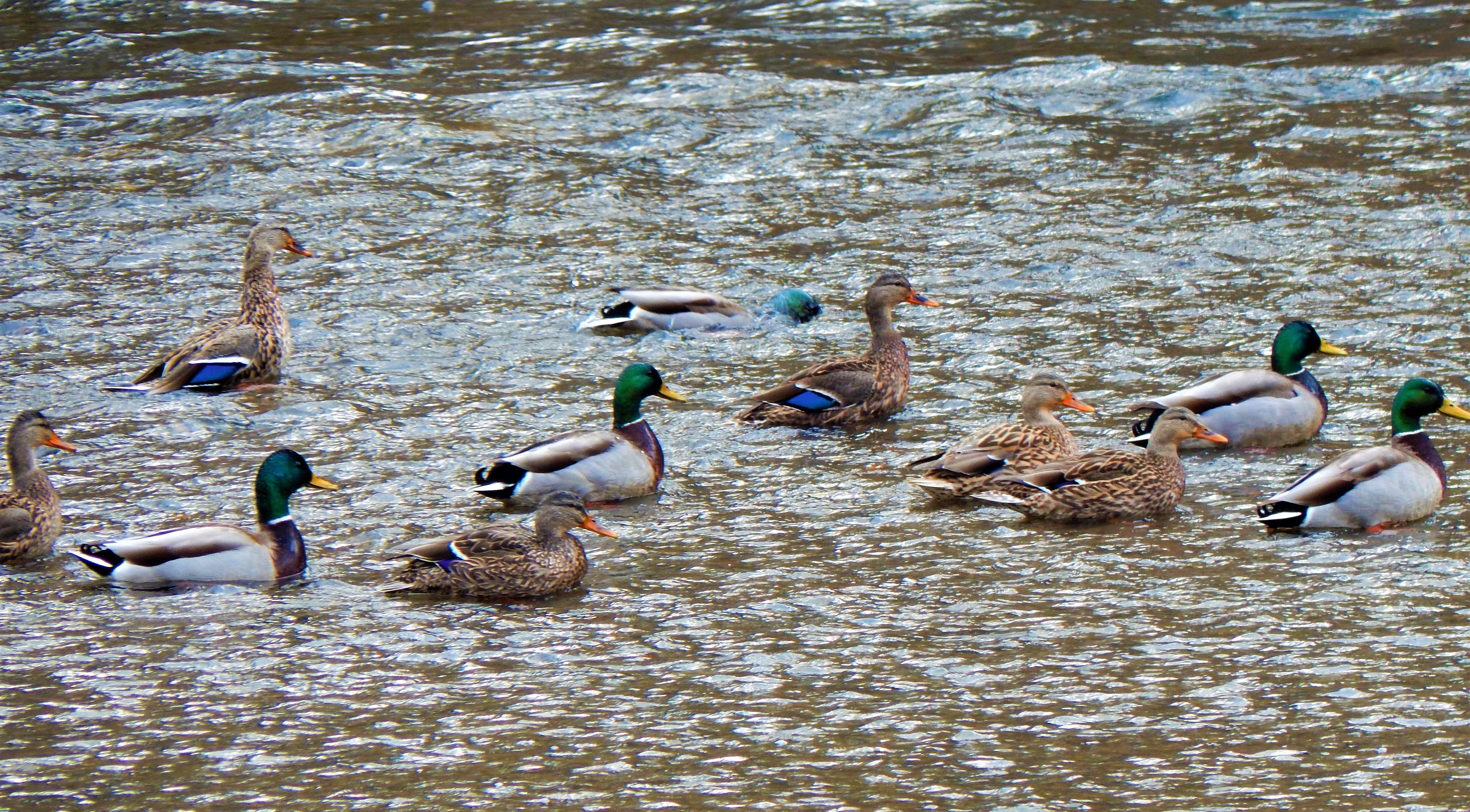 If someone at a park is feeding bread to ducks, chances are there are Mallards in the fray. Perhaps the most familiar of all ducks, Mallards occur throughout North America and Eurasia in ponds and parks as well as wilder wetlands and estuaries. The male’s gleaming green head, gray flanks, and black tail-curl arguably make it the most easily identified duck. Mallards have long been hunted for the table, and almost all domestic ducks come from this species. [All About Birds]