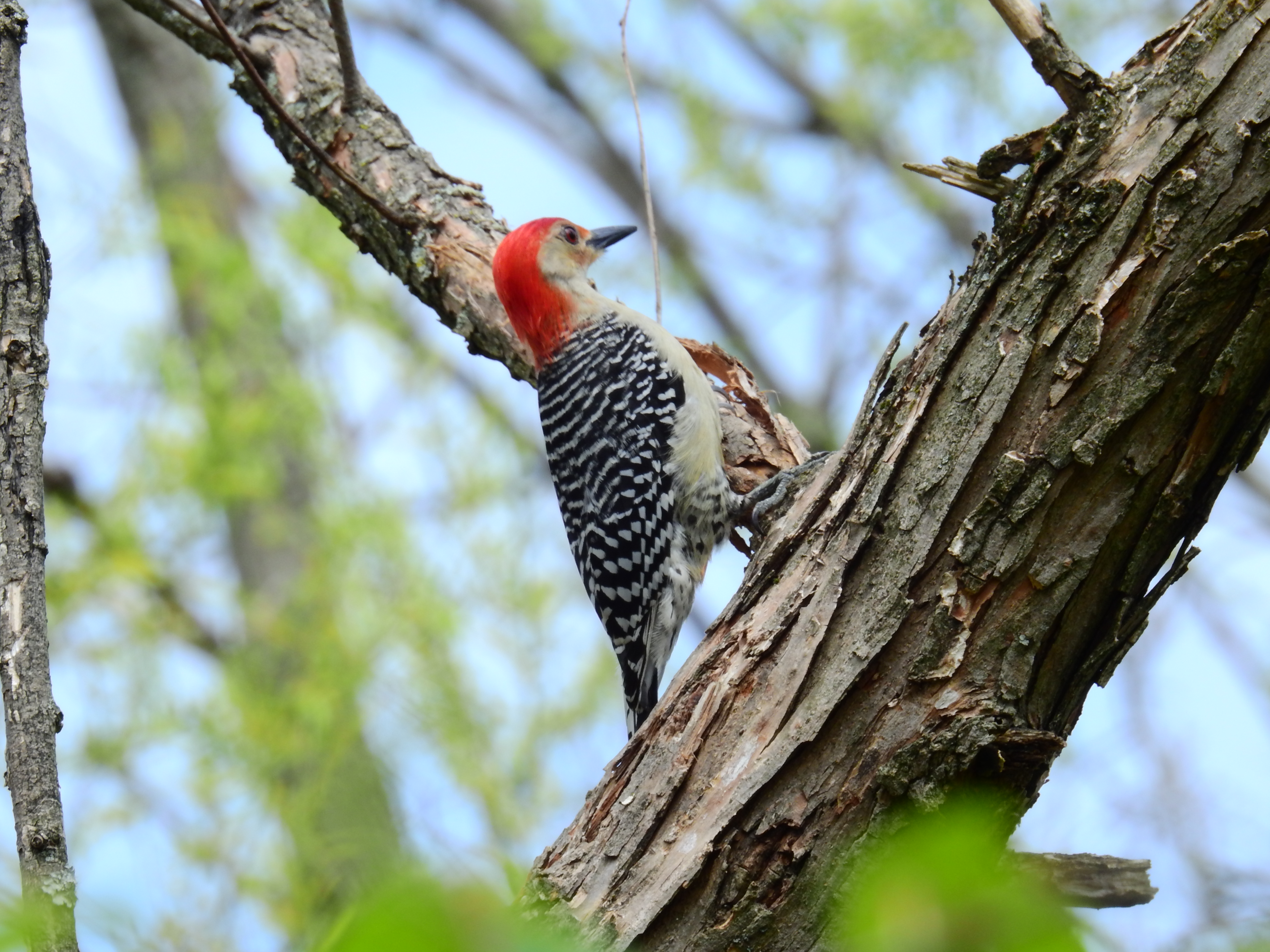 The Red-bellied Woodpecker (Melanerpes carolinus) is a medium-sized woodpecker of the family Picidae. It breeds mainly in the eastern United States, ranging as far south as Florida and as far north as Canada. Its common name is somewhat misleading, as the most prominent red part of its plumage is on the head; the Red-headed Woodpecker, however, is another species that is a rather close relative but looks quite different.