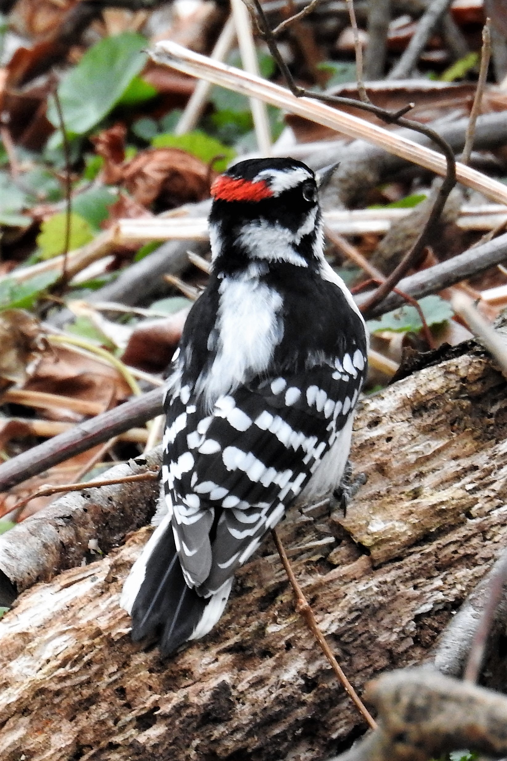 The active little Downy Woodpecker is a familiar sight at backyard feeders and in parks and woodlots, where it joins flocks of chickadees and nuthatches, barely out-sizing them. An often acrobatic forager, this black-and-white woodpecker is at home on tiny branches or balancing on slender plant galls, sycamore seed balls, and suet feeders. Downies and their larger lookalike, the Hairy Woodpecker, are one of the first identification challenges that beginning bird watchers master. [All About Birds]