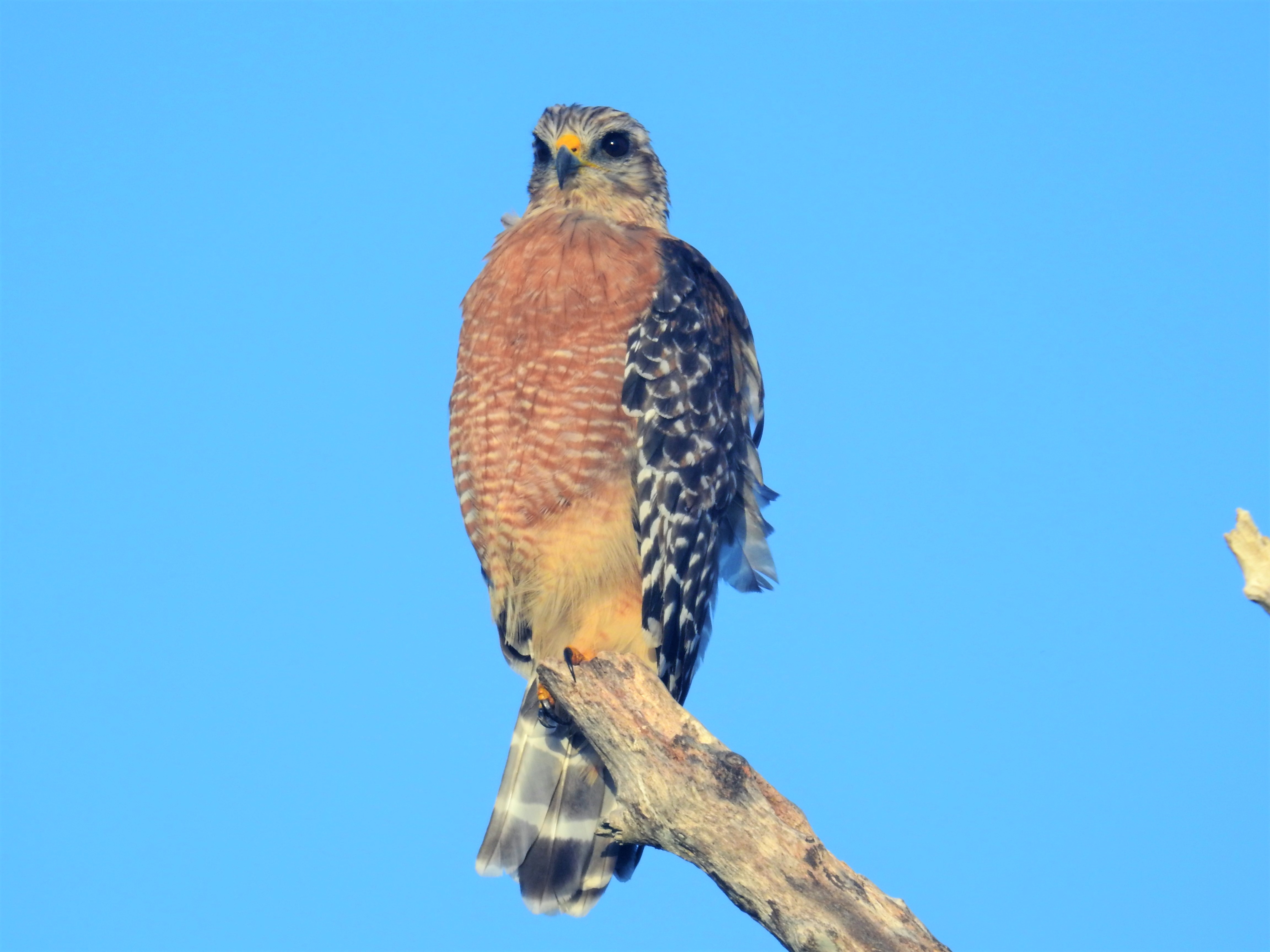 Males are 38 to 58 cm (15 to 23 in) long and weigh on average 550 g (1.21 lb). Females are slightly larger at 47 to 61 cm (19 to 24 in) in length and a mean weight of 700 g (1.5 lb). Adults have brownish heads, reddish chests, and pale bellies with reddish bars. Their tails, which are quite long by Buteo standards, are marked with narrow white bars. Red “shoulders” are visible when the birds are perched. These Hawks’ upper parts are dark with pale spots, and they have long yellow legs. Western birds may appear more red, while Florida birds are generally paler. [Wikipedia]