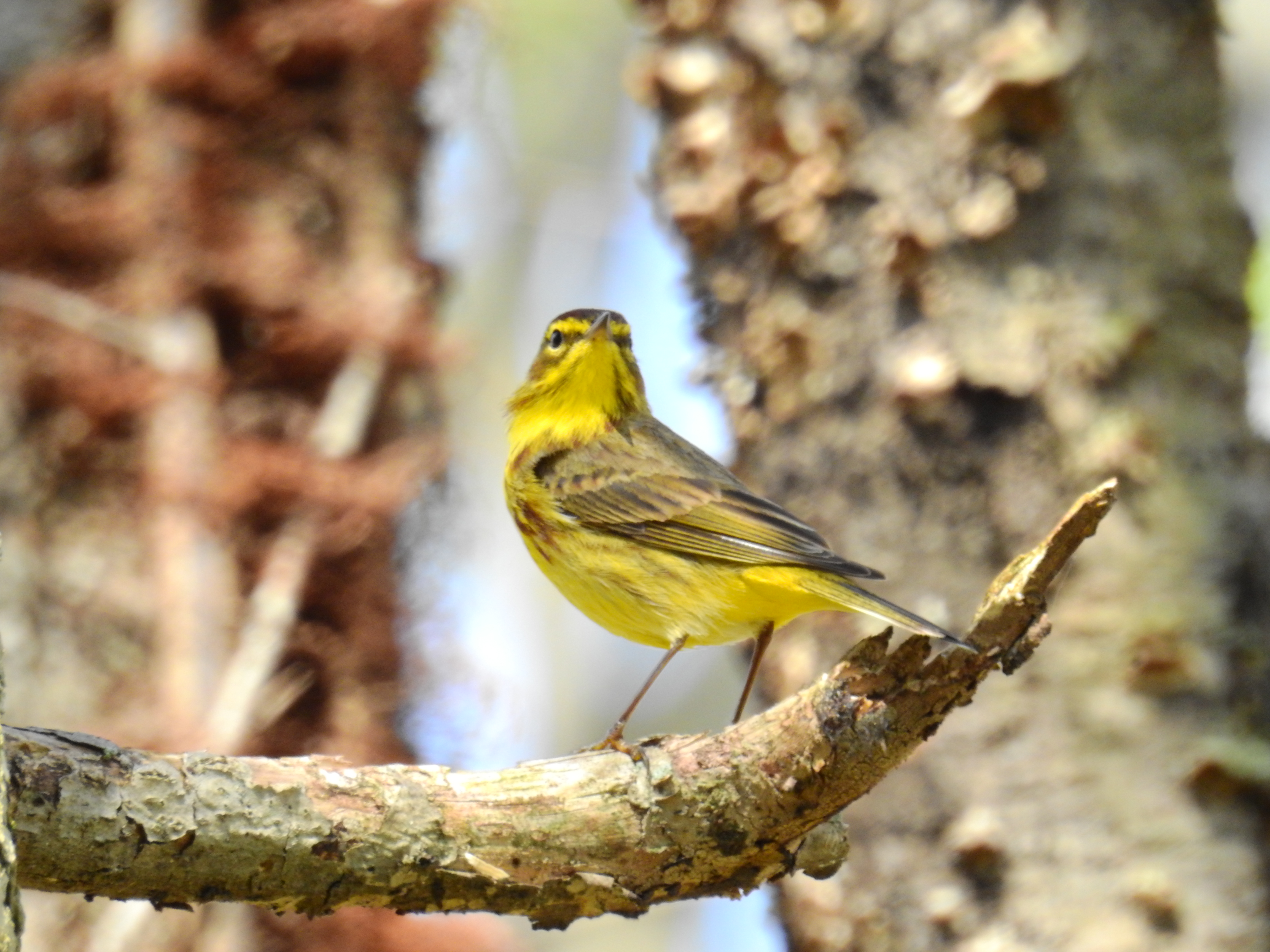 “Yellow Palm Warbler” or “Eastern Palm Warbler” (S. p. hypochrysea) of the eastern third of the breeding range has brownish-olive upperparts and thoroughly yellow underparts with bold rufous breast and flank streaking. It migrates later in the fall than its western counterpart.