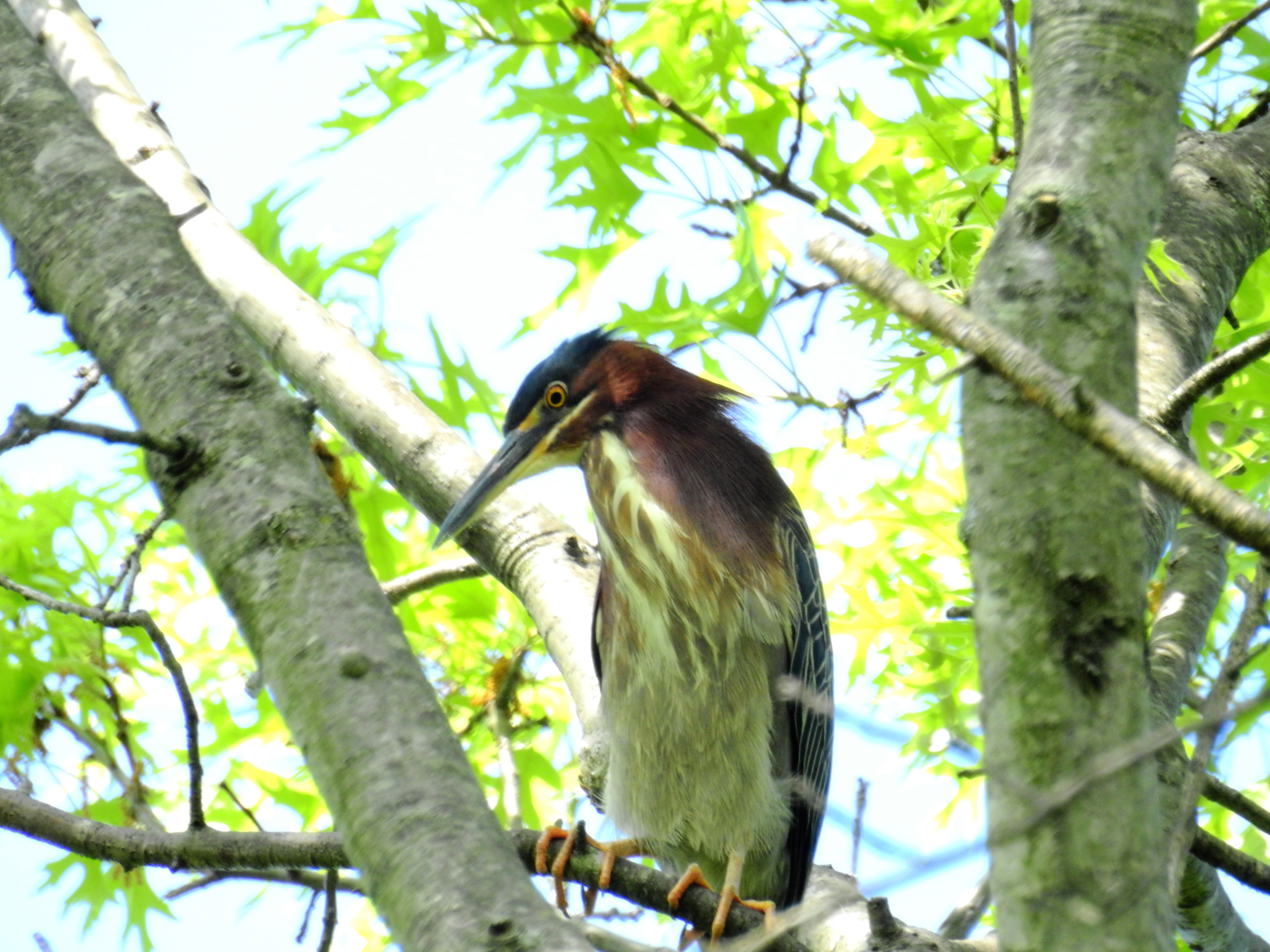 From a distance, the Green Heron is a dark, stocky bird hunched on slender yellow legs at the water’s edge, often hidden behind a tangle of leaves. Seen up close, it is a striking bird with a velvet-green back, rich chestnut body, and a dark cap often raised into a short crest. These small herons crouch patiently to surprise fish with a snatch of their daggerlike bill. They sometimes lure in fish using small items such as twigs or insects as bait. [All About Birds]