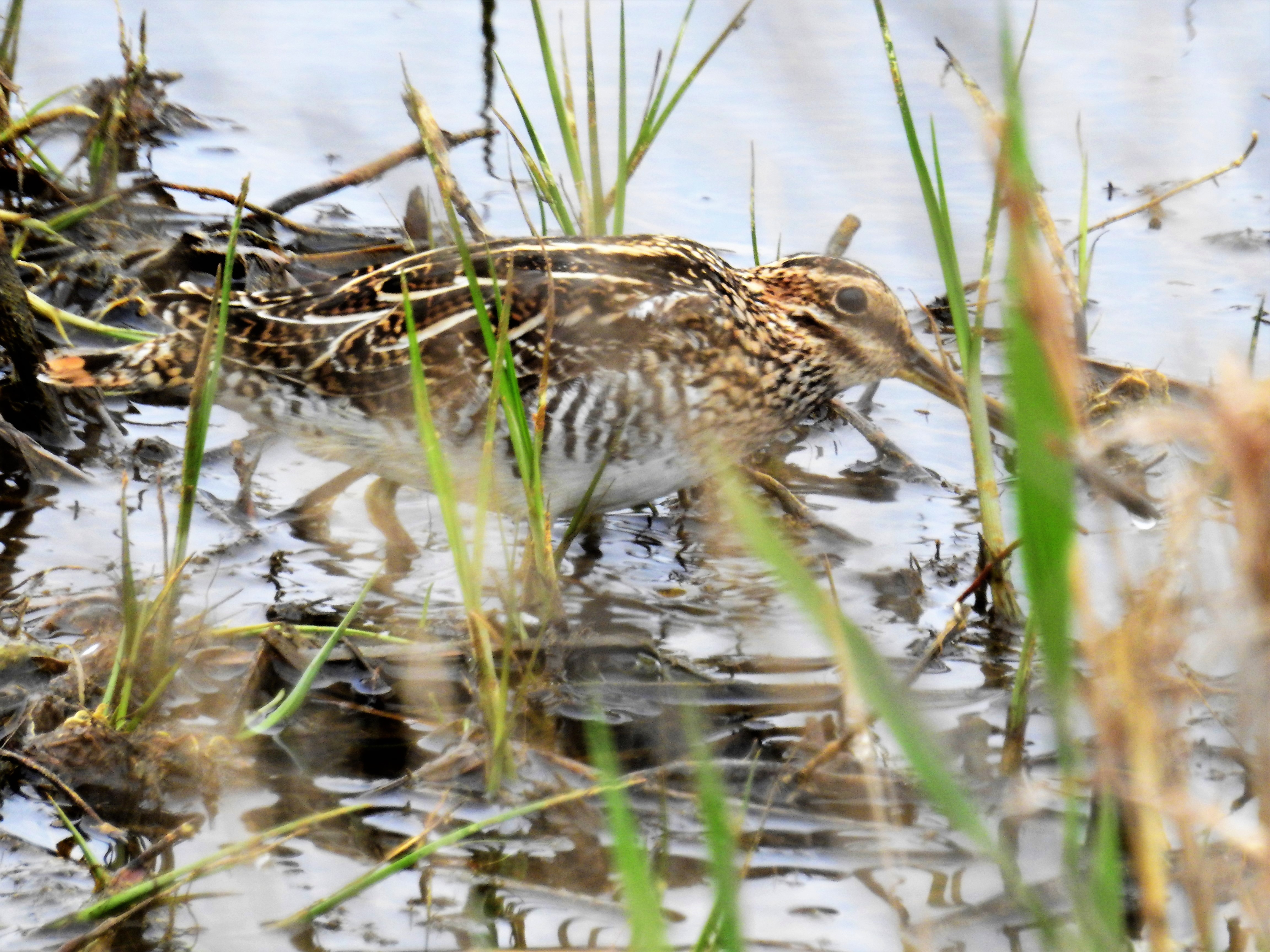 Wilson’s Snipe (Gallinago delicata) is a small, stocky shorebird. They have short greenish-grey legs and a very long straight dark bill. The body is mottled brown on top and pale underneath. They have a dark stripe through the eye, with light stripes above and below it and pointed wings.