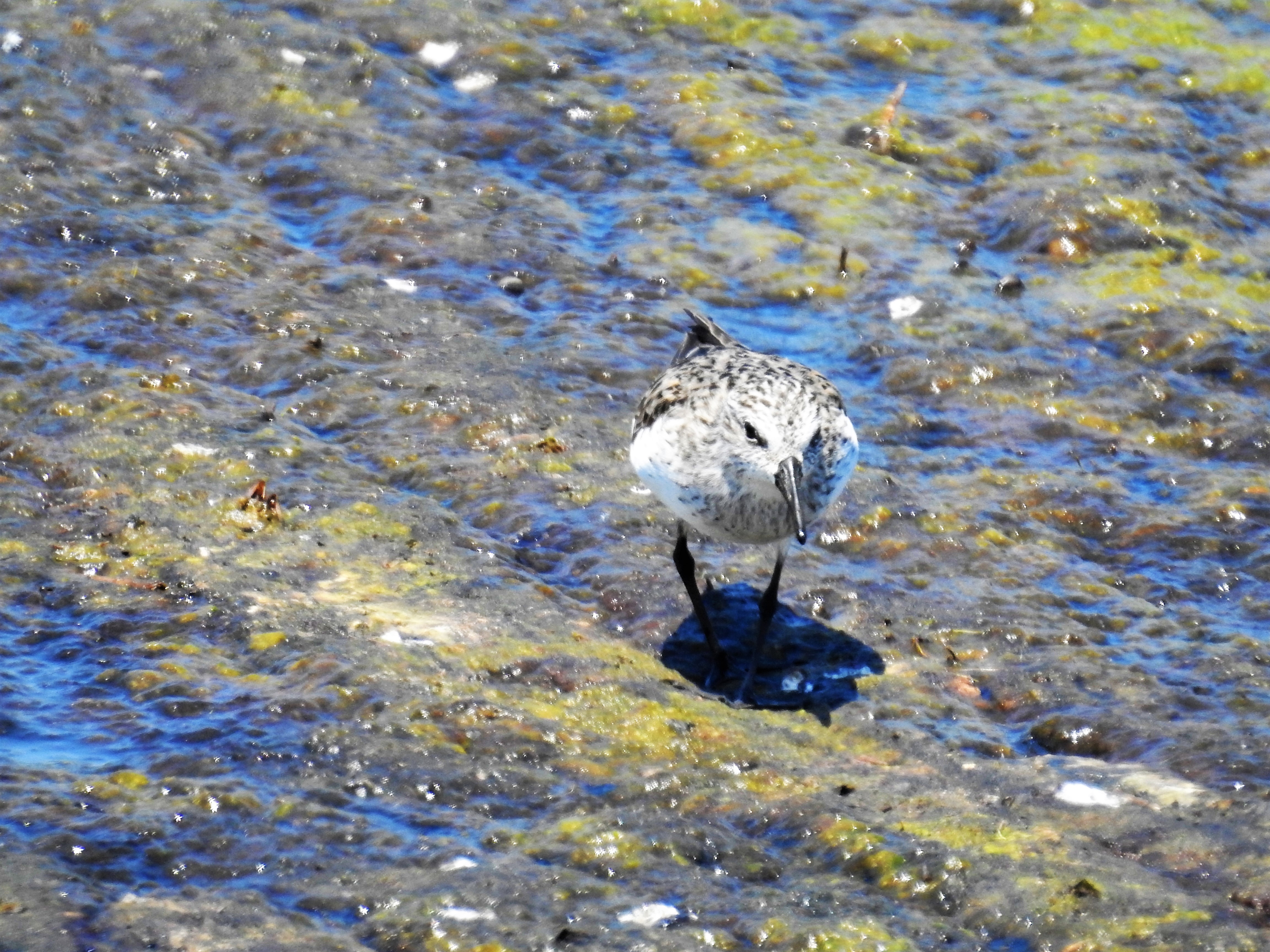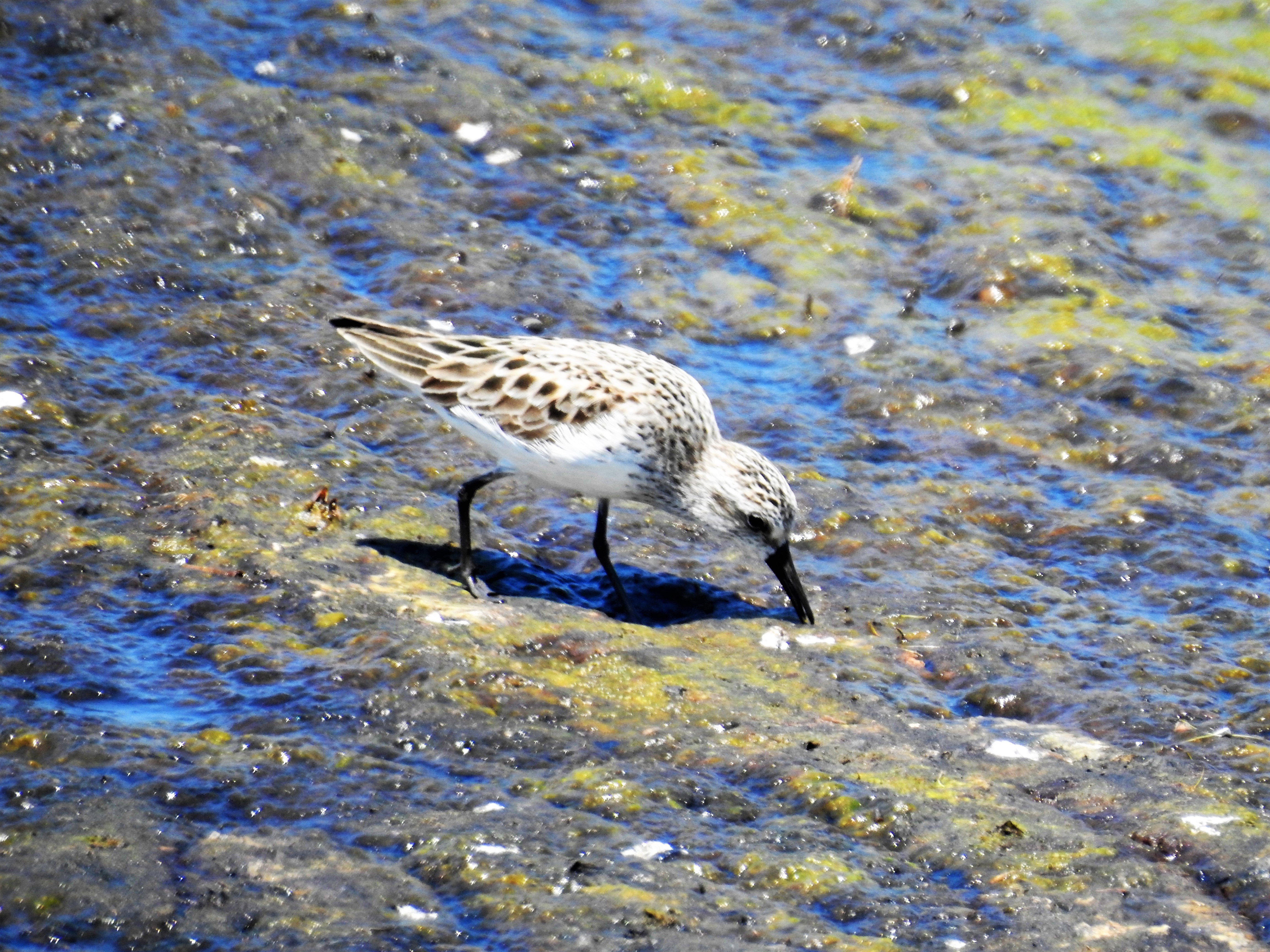 The Semipalmated Sandpiper (Calidris pusilla) is a very small shorebird. It measures 13–15 cm (5.1-5.9 in) long and weighing around 20-32 g (0.7-1.1 oz). Adults have black legs and a short, stout, straight dark bill. The body is dark grey-brown on top and white underneath. The head and neck are tinged light grey-brown. This bird can be difficult to distinguish from other similar tiny shorebirds, in particular, the Western Sandpiper; these are known collectively as “peeps” or “stints.” [Wikipedia]