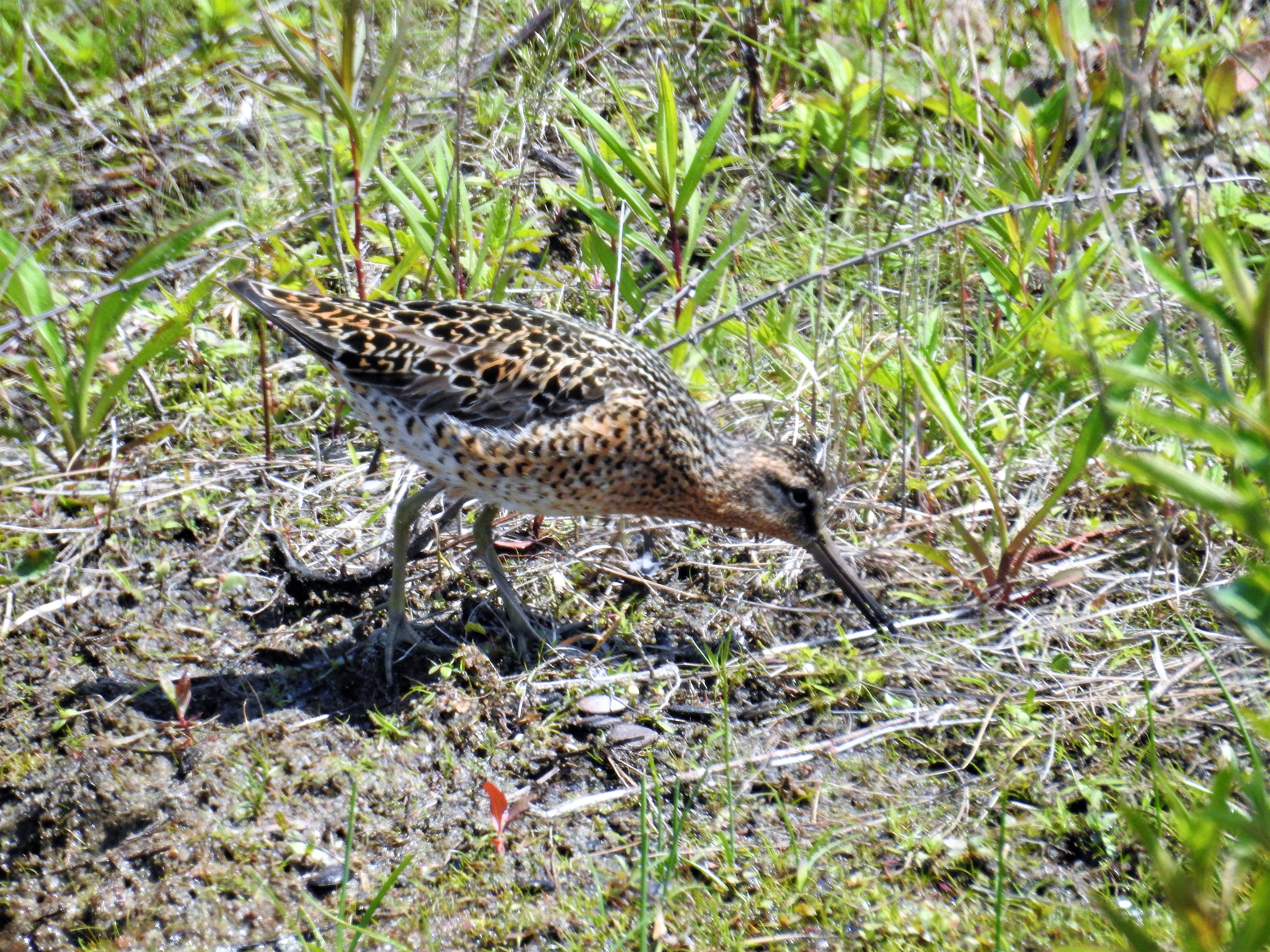 This sandpiper has mottled gray, black, brown and red-brown upperparts, white rump, red-brown underparts with spots and bars, a long, straight dark bill and long, dark yellow-green legs. East and west coast birds are heavier barred and spotted, paler underparts and often show white bellies. [iBird]