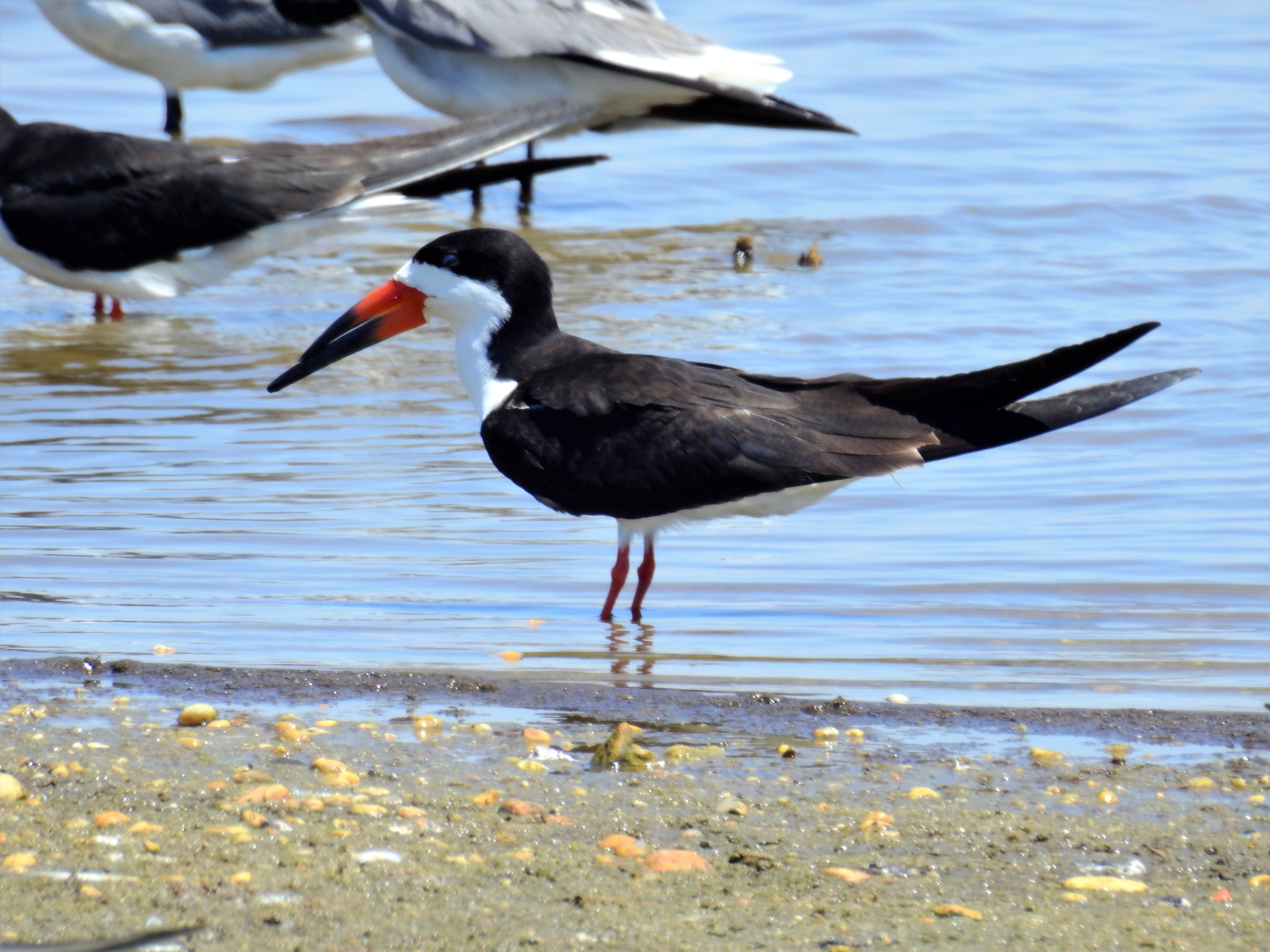 The remarkable bill of the Black Skimmer sets it apart from all other American birds. The large red and black bill is knife-thin, and the lower mandible is longer than the upper. The bird drags the lower bill through the water as it flies along, hoping to catch small fish. [All About Birds]