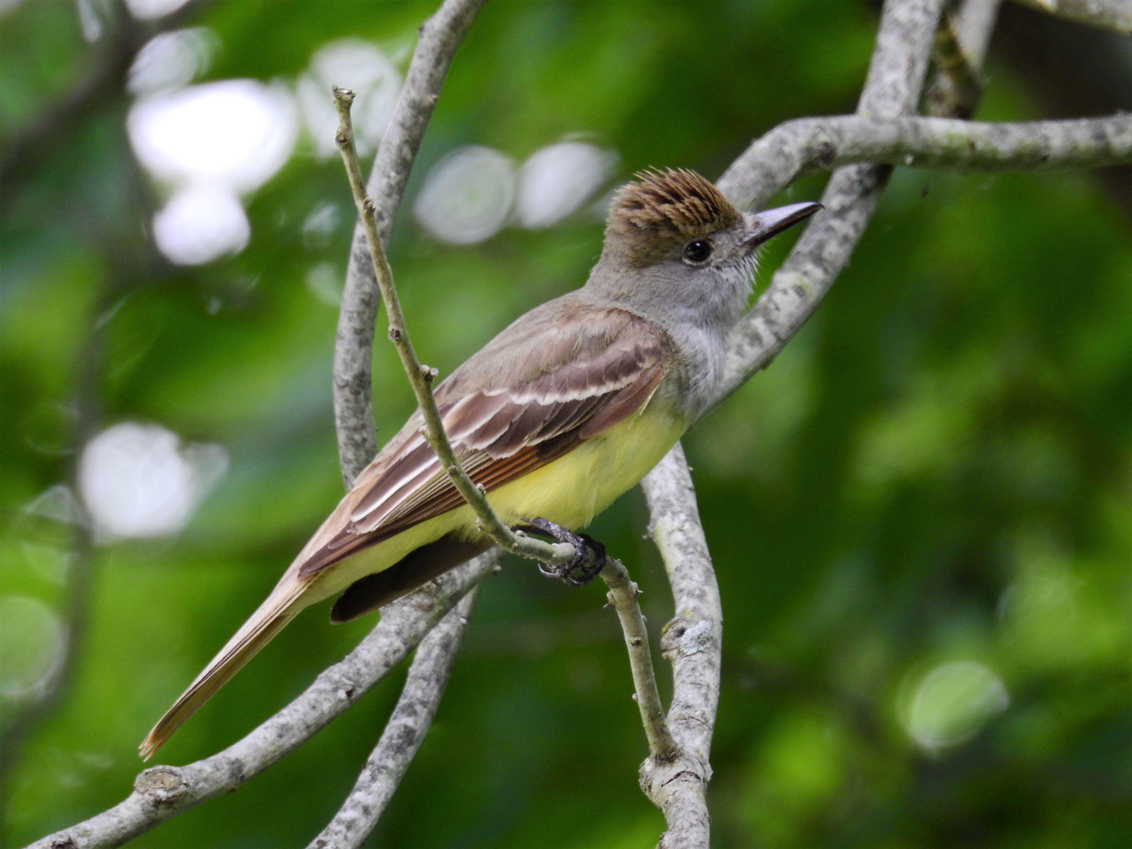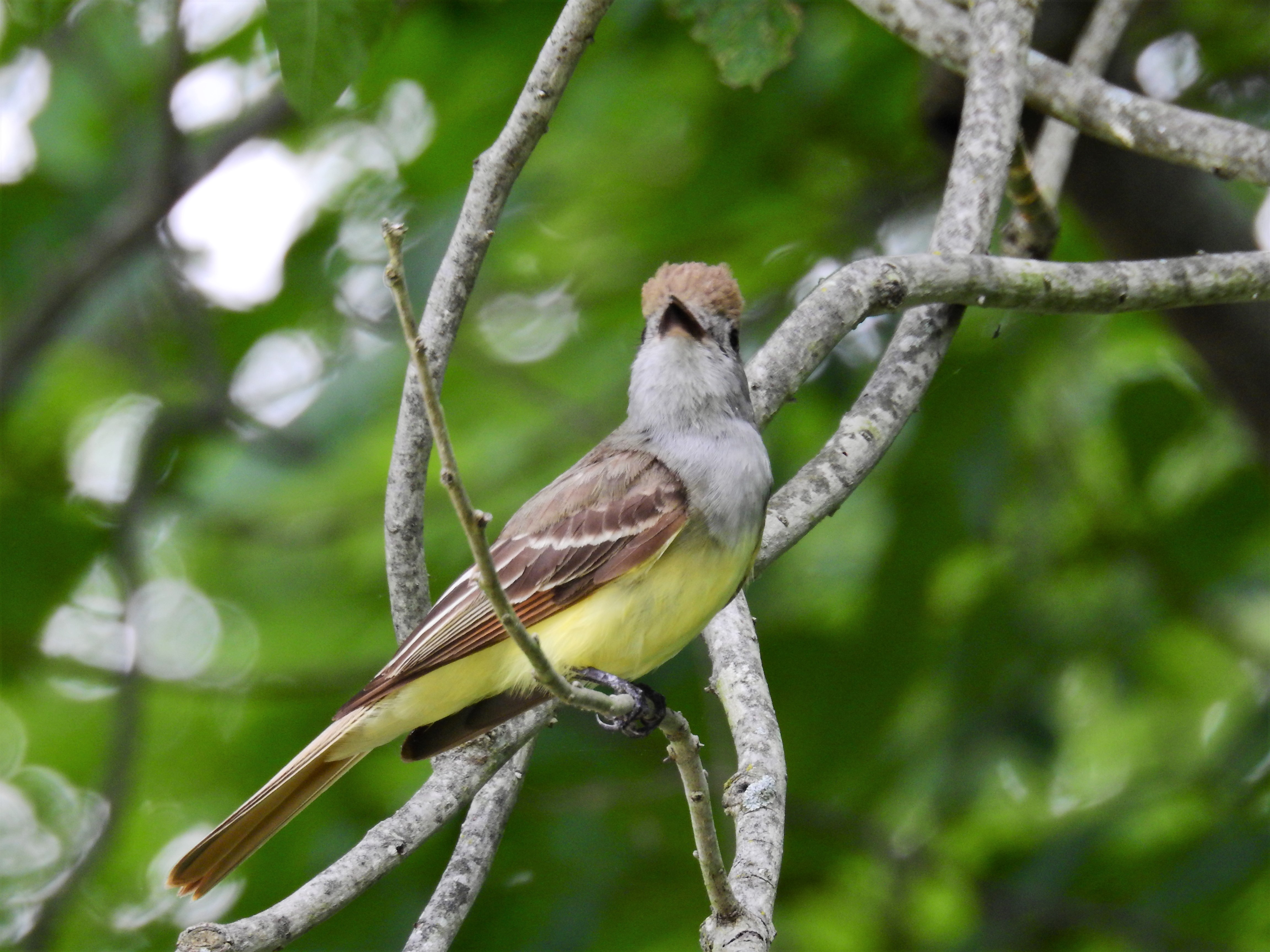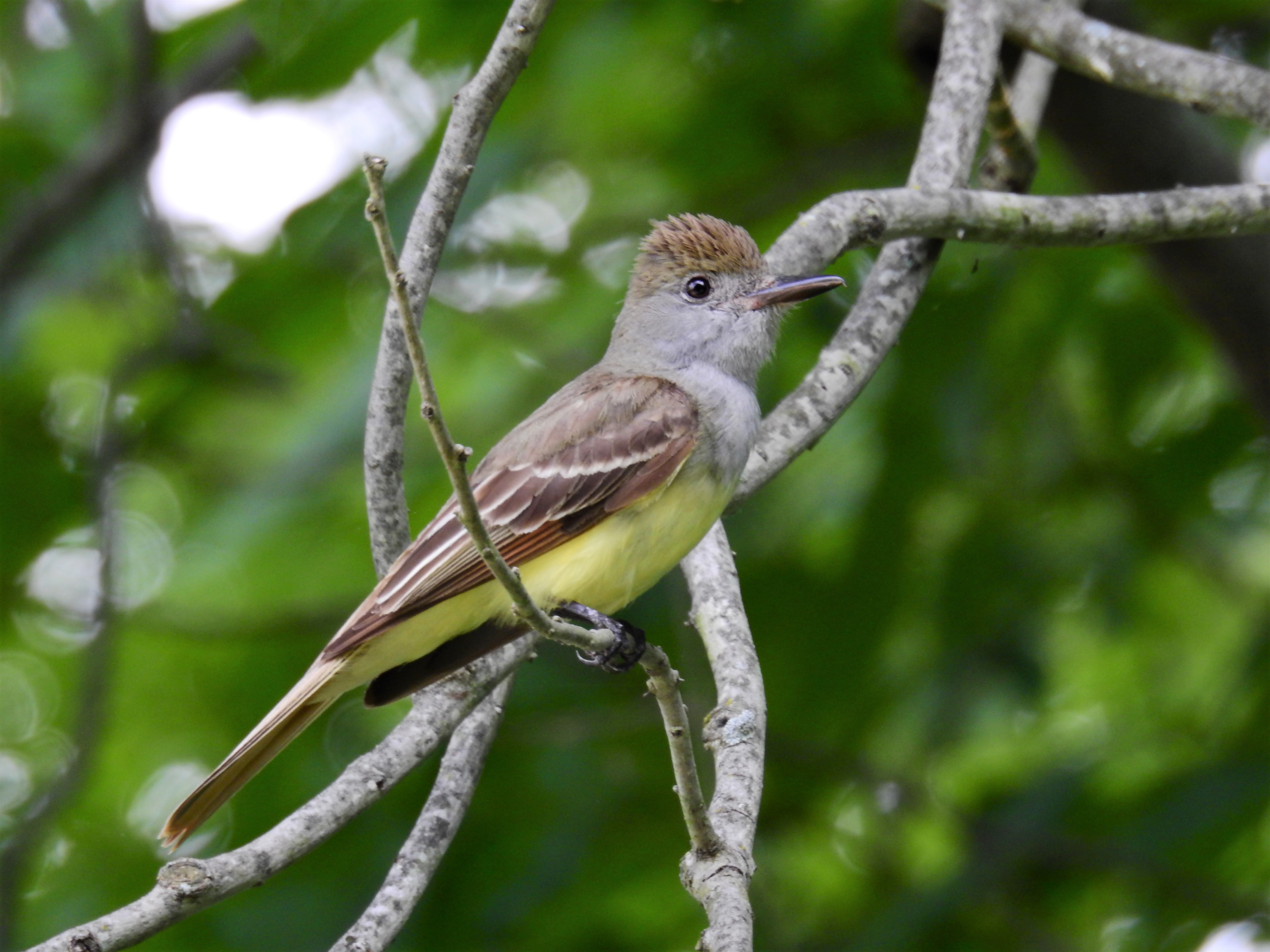 A large, assertive flycatcher with rich reddish-brown accents and a lemon-yellow belly, the Great Crested Flycatcher is a common bird of Eastern woodlands. Its habit of hunting high in the canopy means it’s not particularly conspicuous—until you learn its very distinctive call, an emphatic rising whistle. These flycatchers swoop after flying insects and may crash into the foliage in pursuit of leaf-crawling prey. They are the only Eastern flycatchers that nest in cavities, and this means they sometimes make use of nest boxes. [All About Birds]