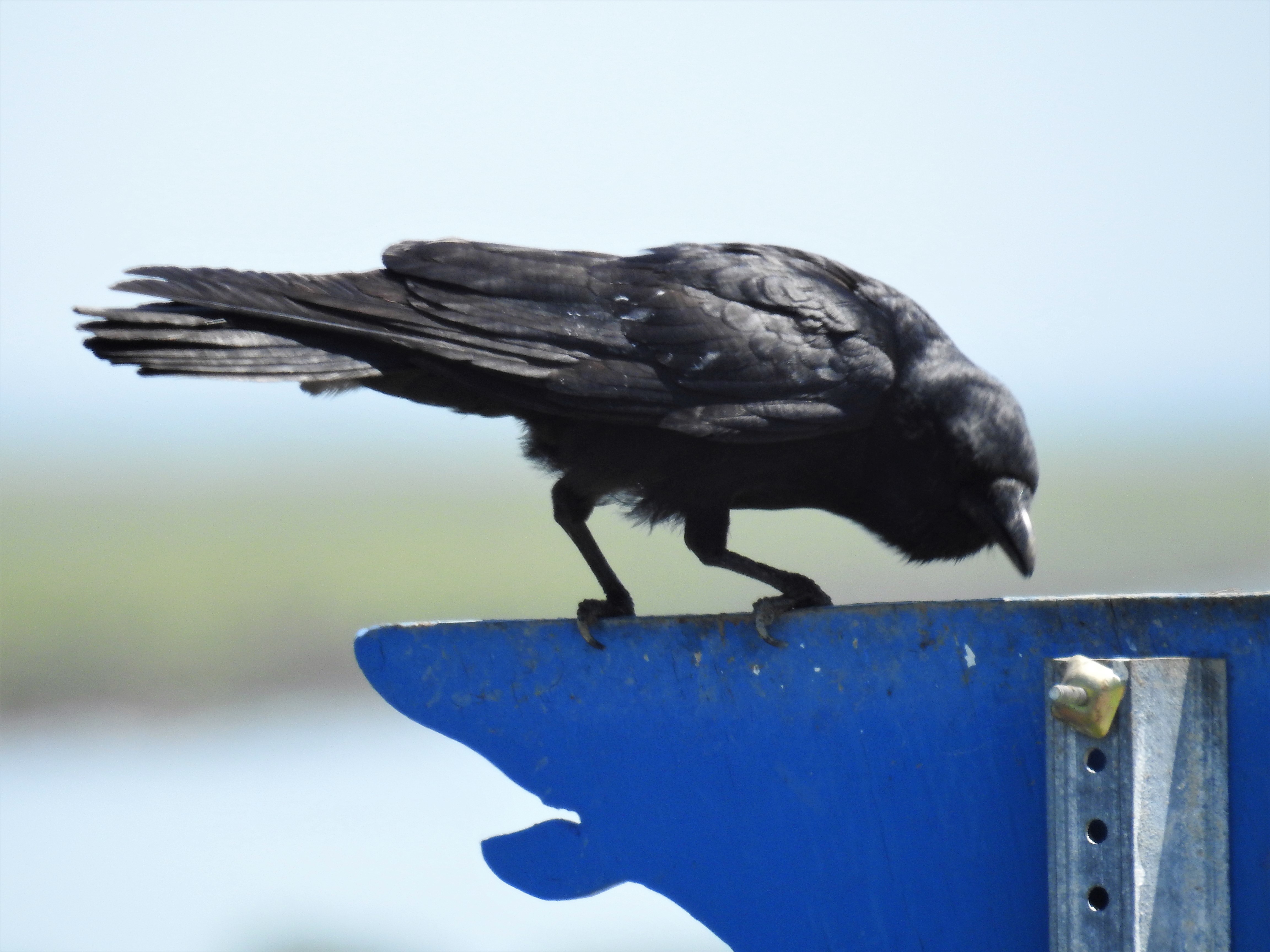 The Fish Crow is superficially similar to the American Crow, but is smaller (36–41 cm in length) and has a silkier smooth plumage by comparison. The upperparts have a blue or blue-green sheen, while the underparts have a more greenish tint to the black. The eyes are dark brown. The differences are often only really apparent between the two species when seen side by side or when heard calling. The bill is usually somewhat slimmer than the American crow but is only readily distinguishable if both species are seen together. [Wikipedia]