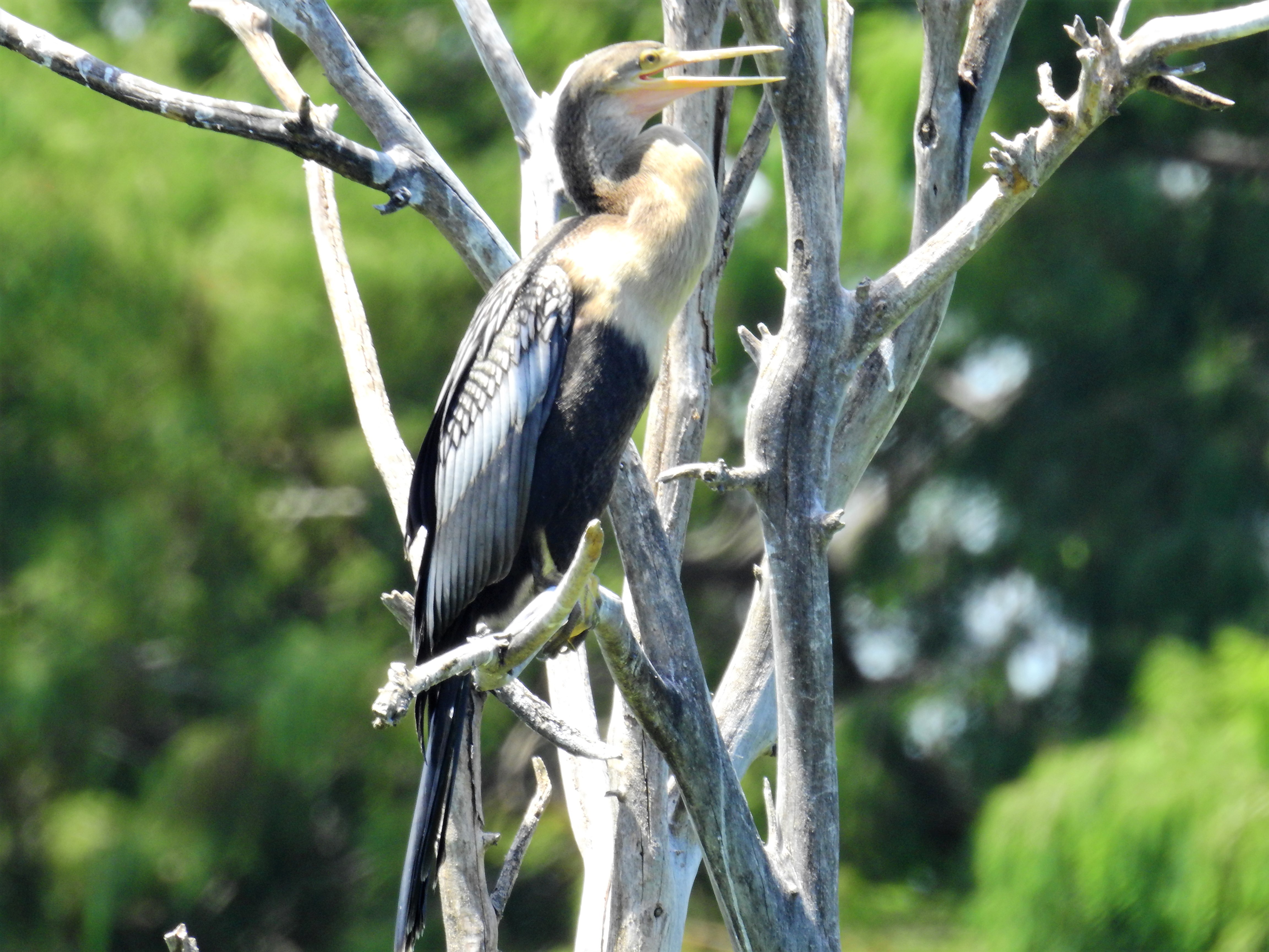 This bird is often mistaken for the Double-crested Cormorant due to its similar size and shape, although the two species can be differentiated by their tails and bills. The tail of the Anhinga is wider and much longer than that of the Cormorant. The bill of the Anhinga is pointed, while the bill of the Cormorant has a hook-tip. [Wikipedia]