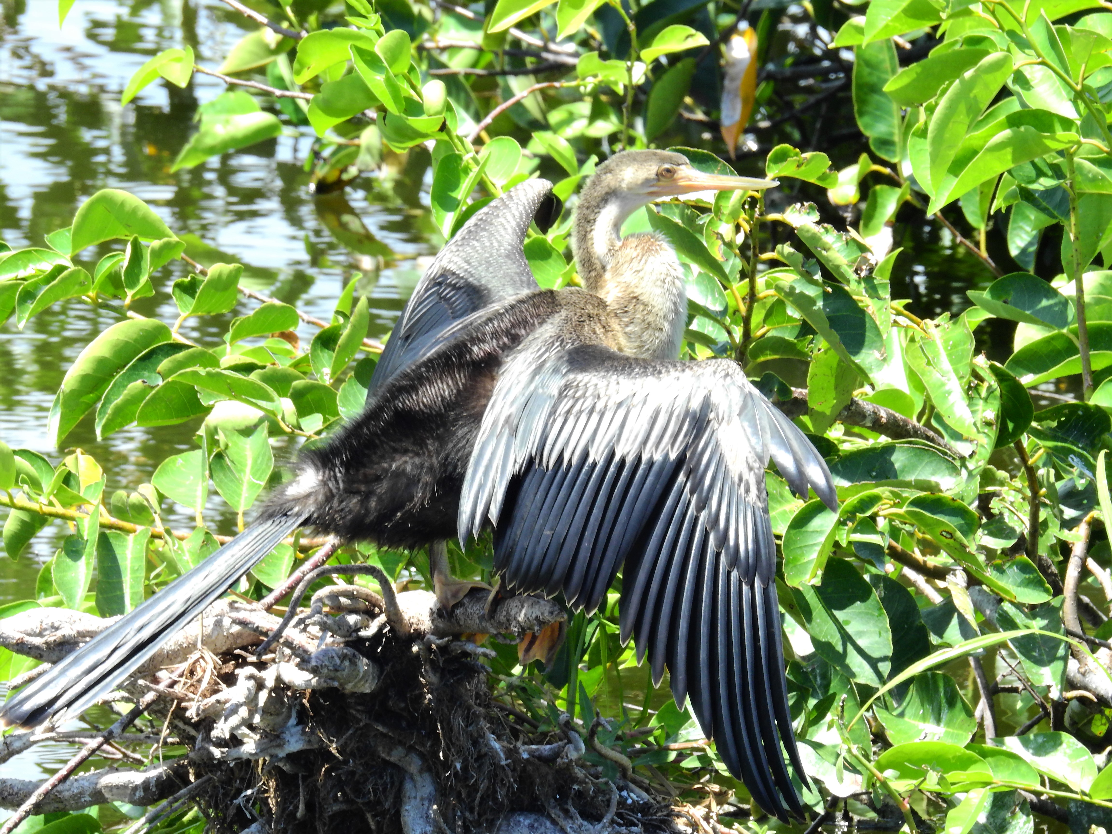 The Anhinga, sometimes called Snakebird, Darter, American Darter, or Water Turkey, is a water bird of the warmer parts of the Americas. The word Anhinga comes from the Brazilian Tupi language and means devil bird or snake bird. When swimming the origin of the name snakebird is apparent: only the colored neck appears above water, so the bird looks like a snake ready to strike. They do not have external nares (nostrils) and breathe solely through their epiglottis.