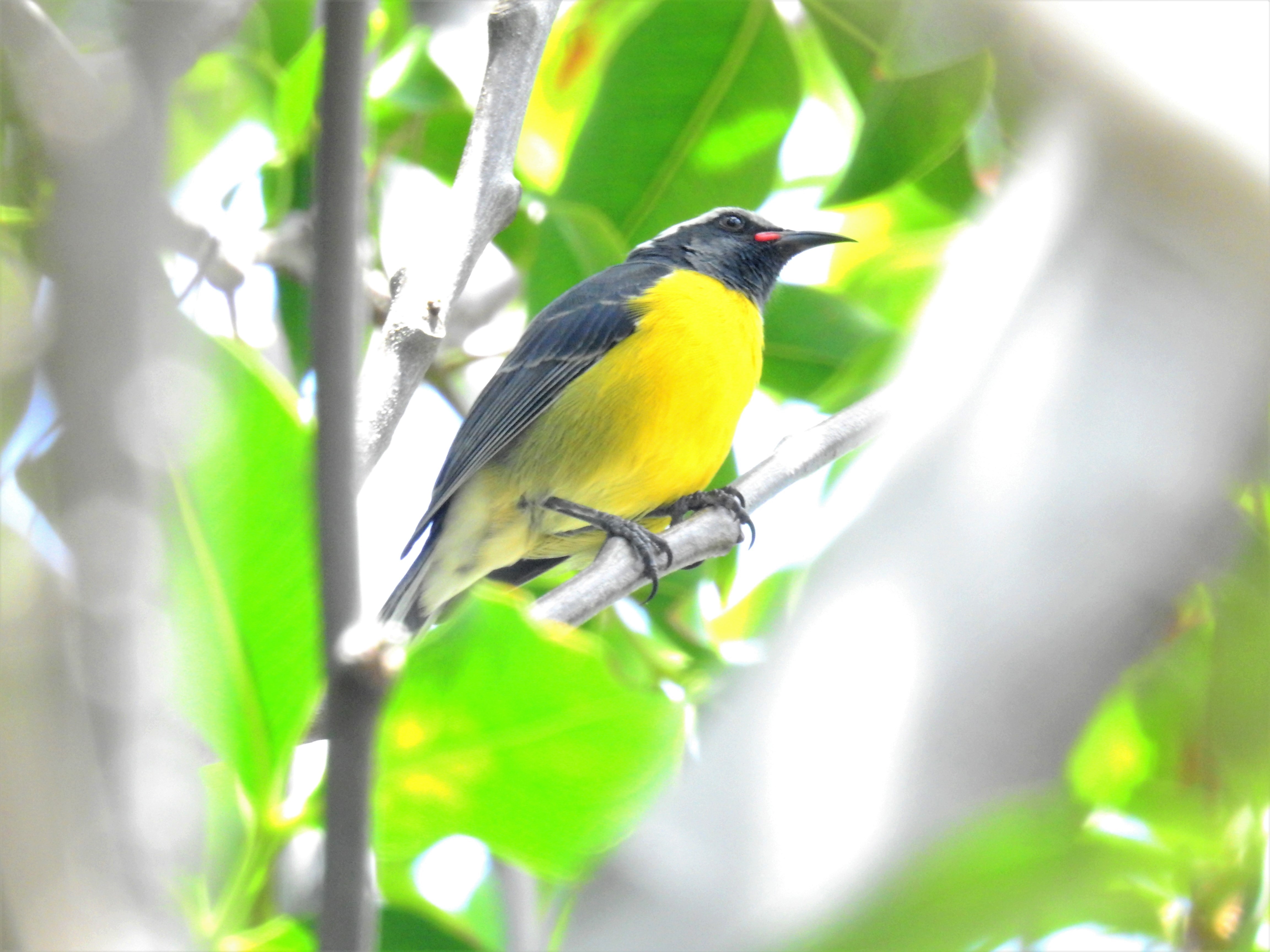The Bananaquit (Coereba flaveola) is a species of passerine bird of uncertain relation. It is tentatively placed in the tanager family but classified as incertae sedis by other authorities such as the American Ornithologists’ Union. Its classification is debated, and it is often placed in its own family: Coerebidae. It has recently been suggested the Bananaquit should be split into three species, but this has yet to receive widespread recognition. This small, active nectarivore is found in warmer parts of the Americas and is generally common. [Wikipedia]
