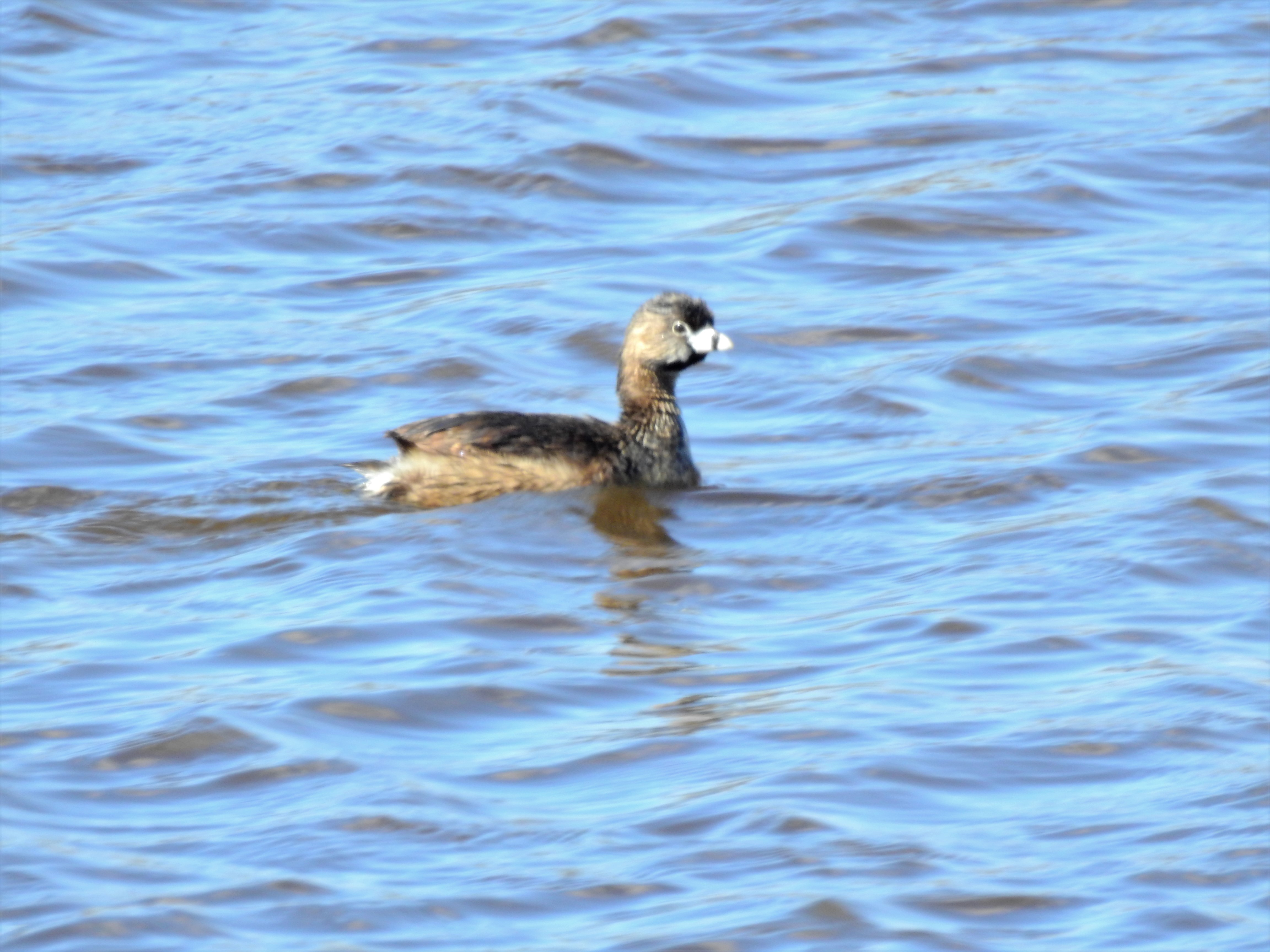The Pied-billed Grebe (Podilymbus podiceps) is a species of the grebe family of water birds. Since the Atitlán Grebe (Podilymbus gigas) has become extinct, it is the sole extant member of the genus Podilymbus. The pied-billed grebe is primarily found in ponds throughout the Americas. Other names of this grebe include American Dabchick, Dabchick, Carolina Grebe, Devil-diver, Dive-dapper, Dipper, Dell-diver, Pied-billed Dabchick, Pied-bill, Thick-billed grebe, and Water Witch. [Wikipedia]
