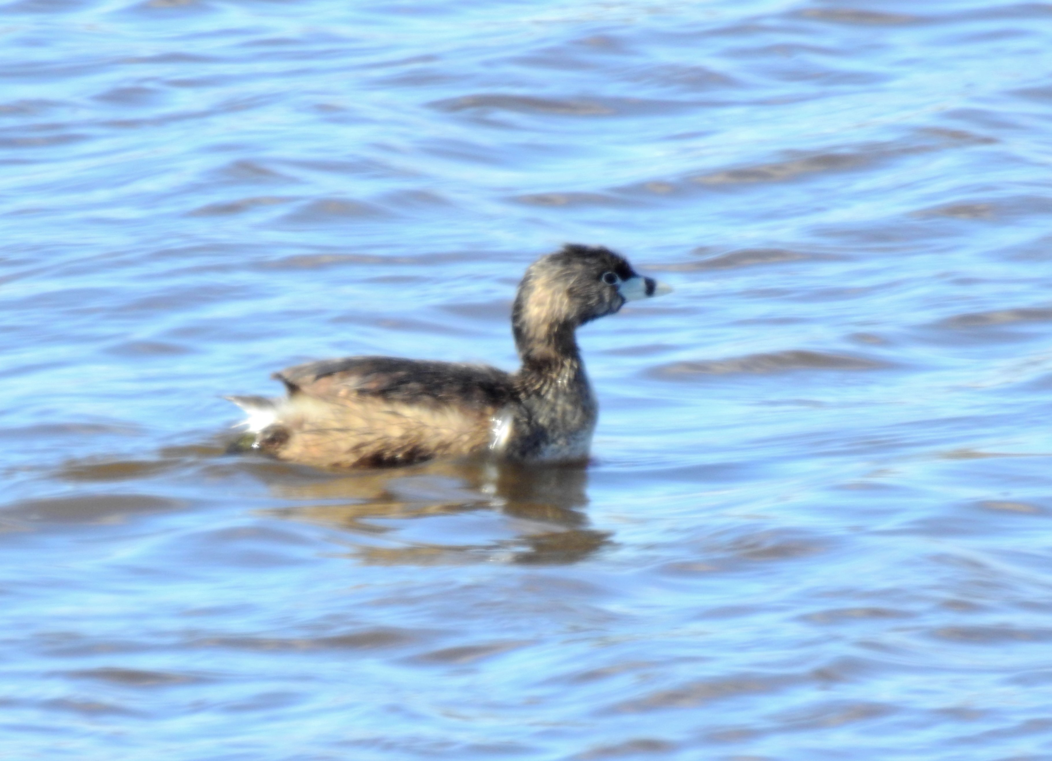 Part bird, part submarine, the Pied-billed Grebe is common across much of North America. These small brown birds have unusually thick bills that turn silver and black in summer. These expert divers inhabit sluggish rivers, freshwater marshes, lakes, and estuaries. They use their chunky bills to kill and eat large crustaceans along with a great variety of fish, amphibians, insects, and other invertebrates. Rarely seen in flight and often hidden amid vegetation, Pied-billed Grebes announce their presence with loud, far-reaching calls. [All About Birds]