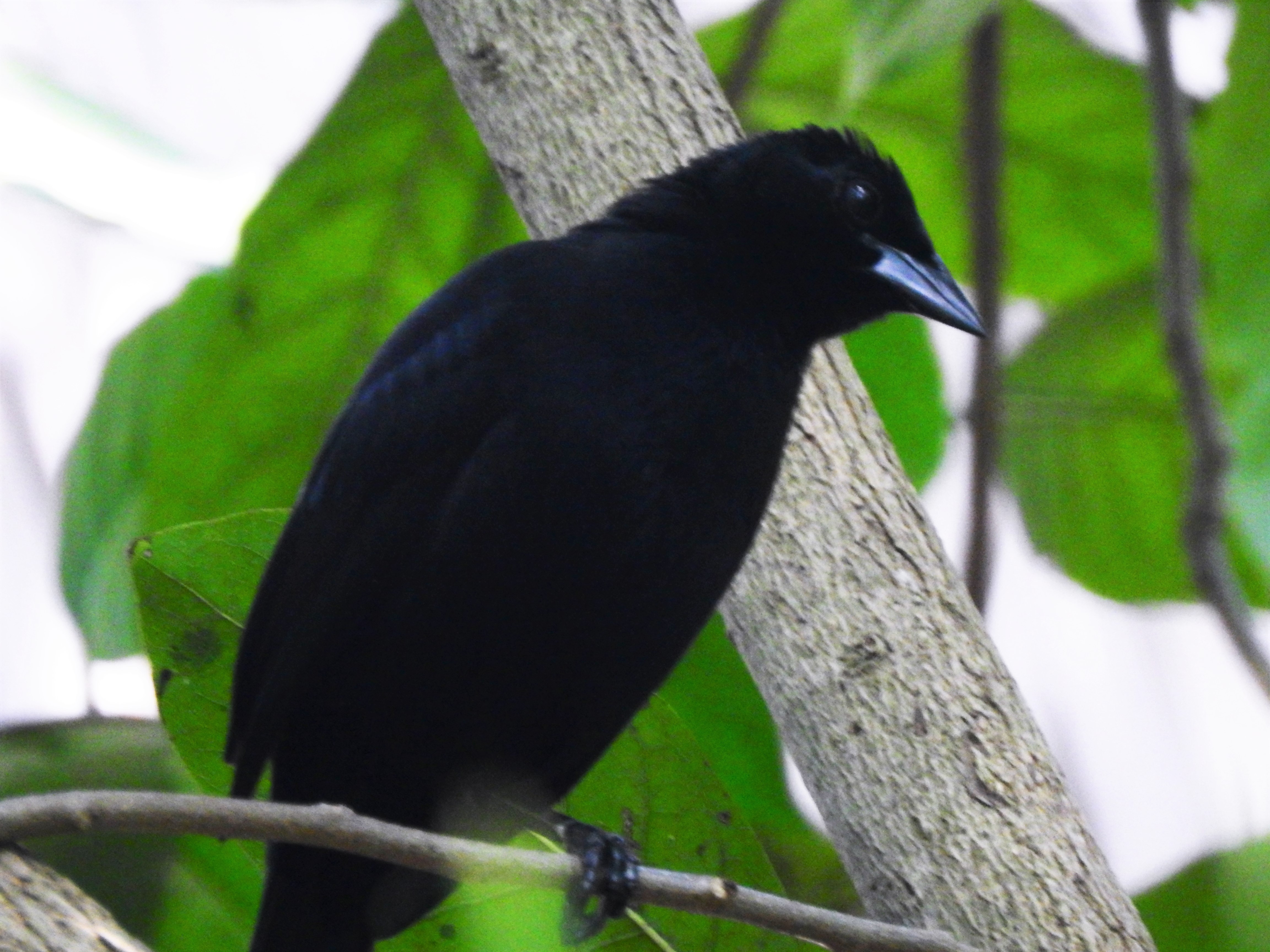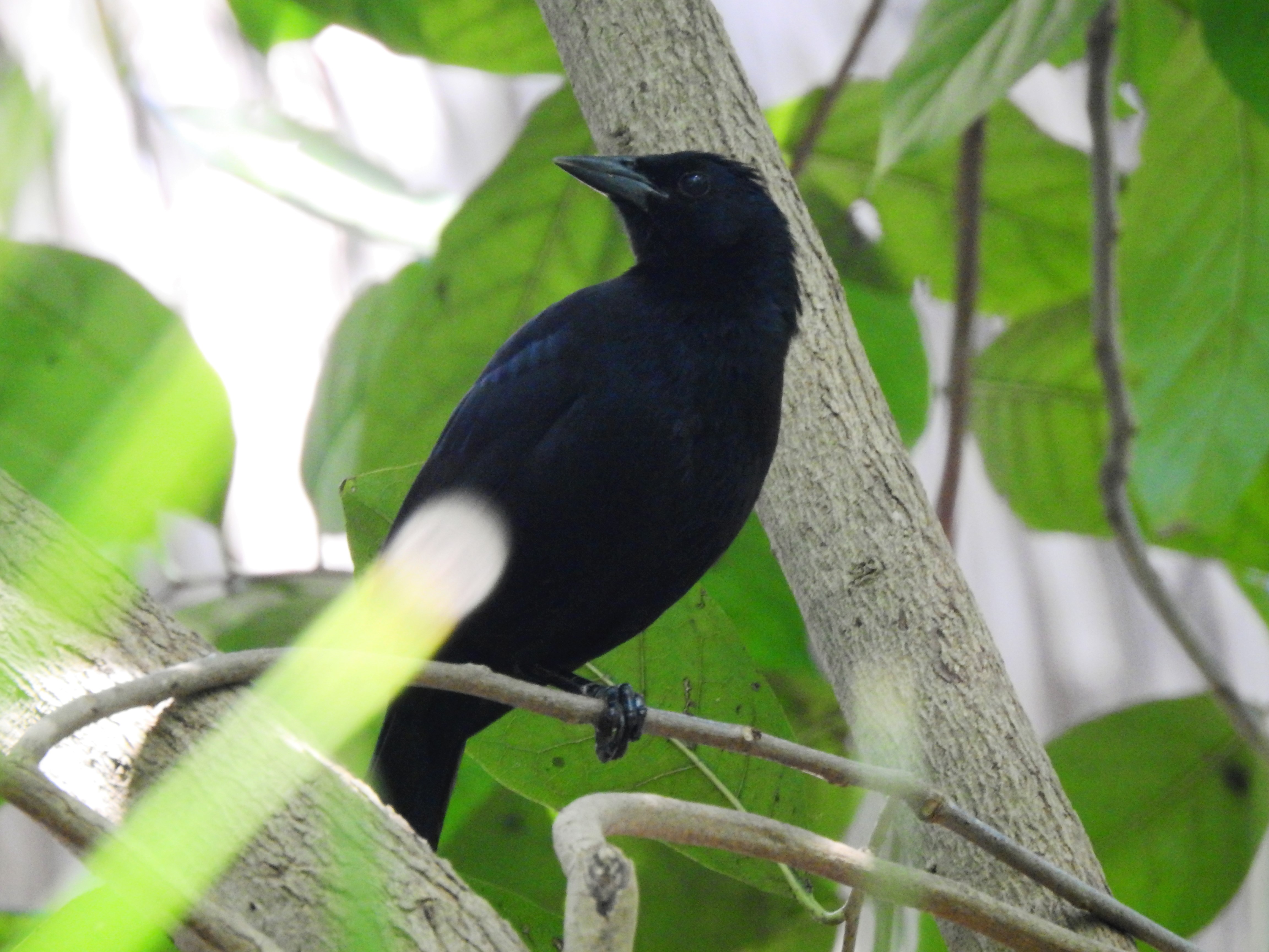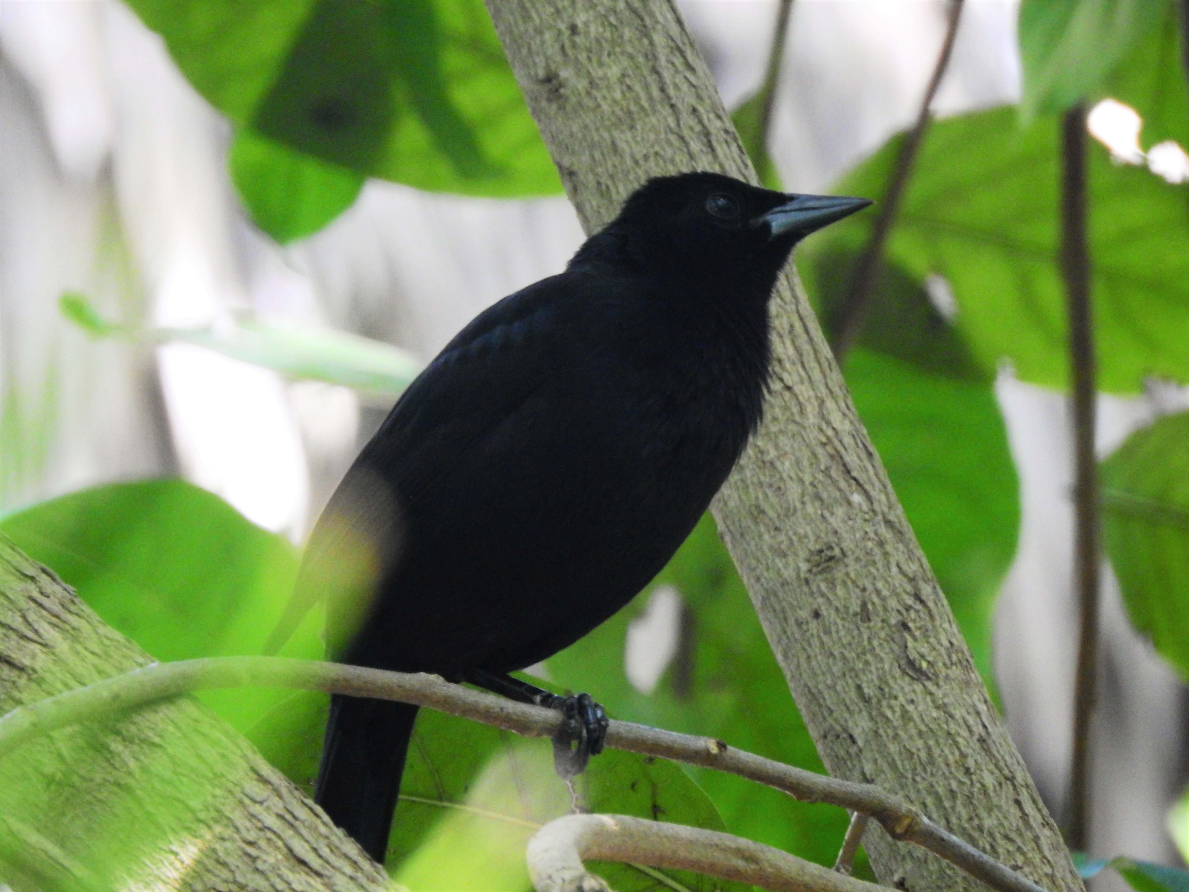 The Melodious Blackbird (Dives dives) is a New World tropical icterid bird. The adult is a medium-sized blackbird with a rounded tail. The male is 10.0 inches long and weighs 3.8 oz. The slightly smaller female is 9.1 inches long and weighs 3.4 oz. The adult plumage is entirely black with a bluish gloss, and the bill, legs, and feet are also black. Females are identically plumaged to the males, but young birds are brownish black and lack iridescence. There are no subspecies.