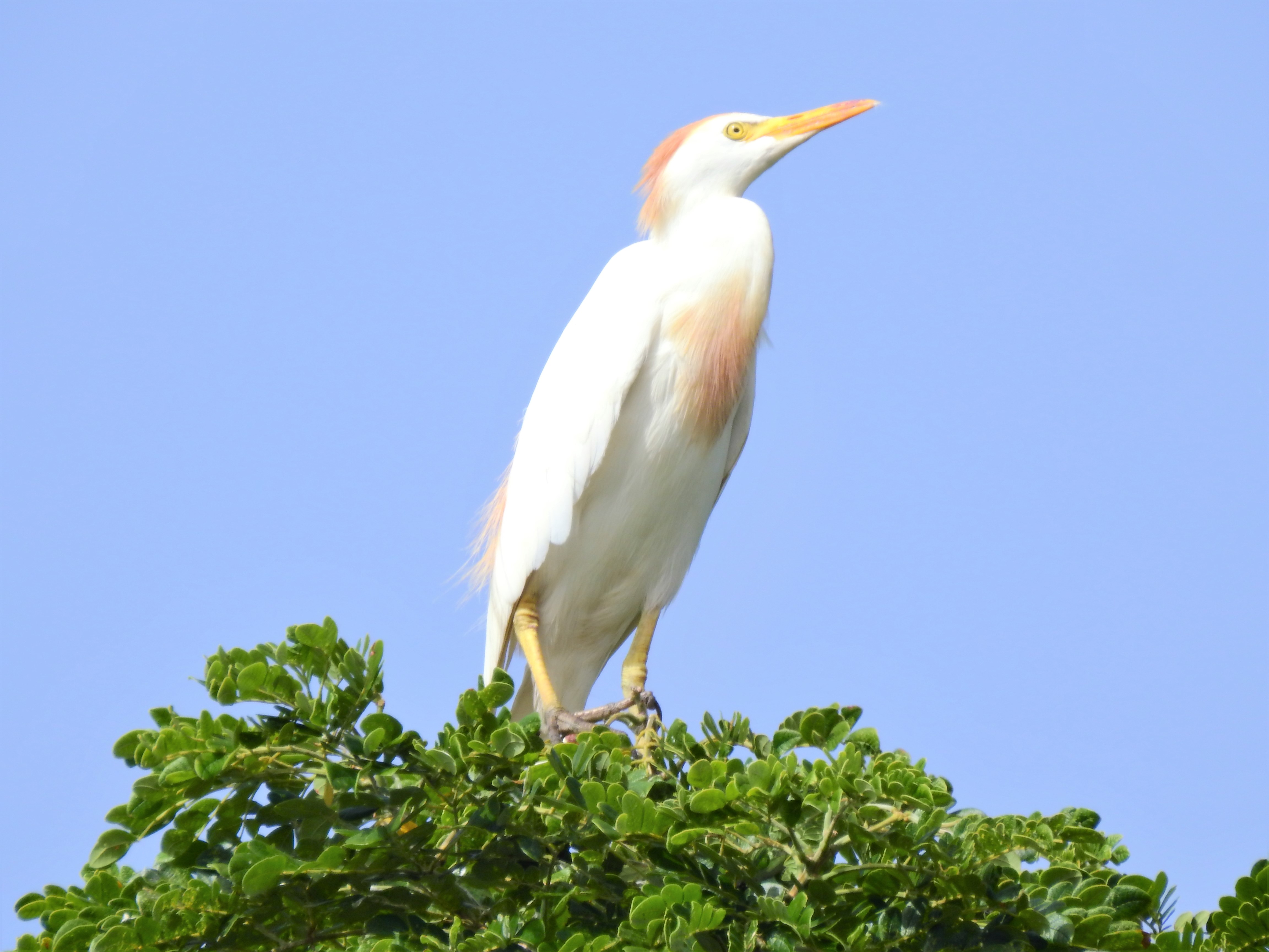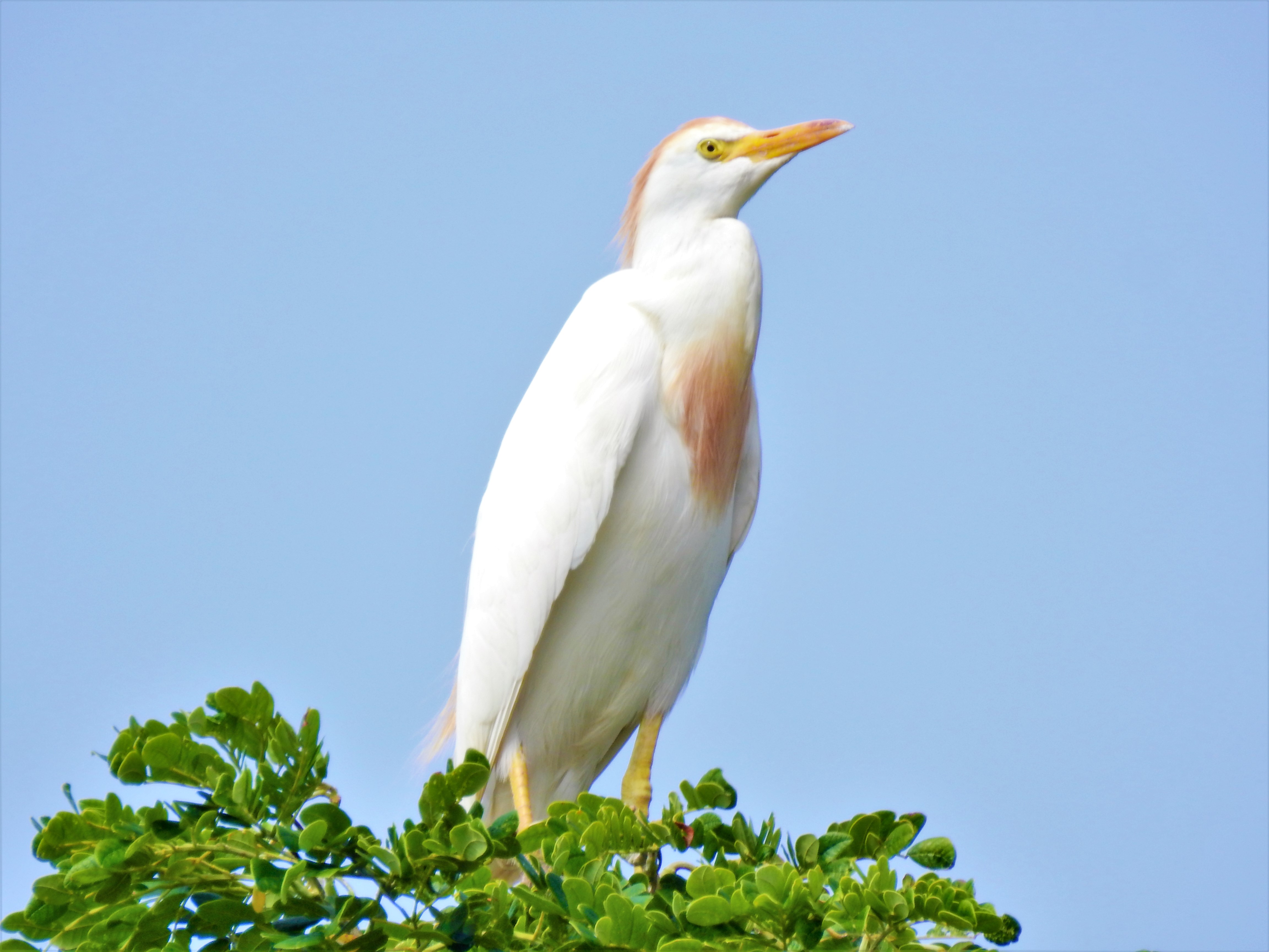 The Cattle Egret is a stocky heron with a 35–38 inches wingspan; it is 8–22 inches long and weighs 9.5–18.1 ounces. It has a relatively short thick neck, a sturdy bill, and a hunched posture. The non-breeding adult has mainly white plumage, a yellow bill, and grayish-yellow legs. During the breeding season, adults of the nominate Western subspecies develop orange-buff plumes on the back, breast, and crown, and the bill, legs, and irises become bright red for a brief period before pairing. [Wikipedia]