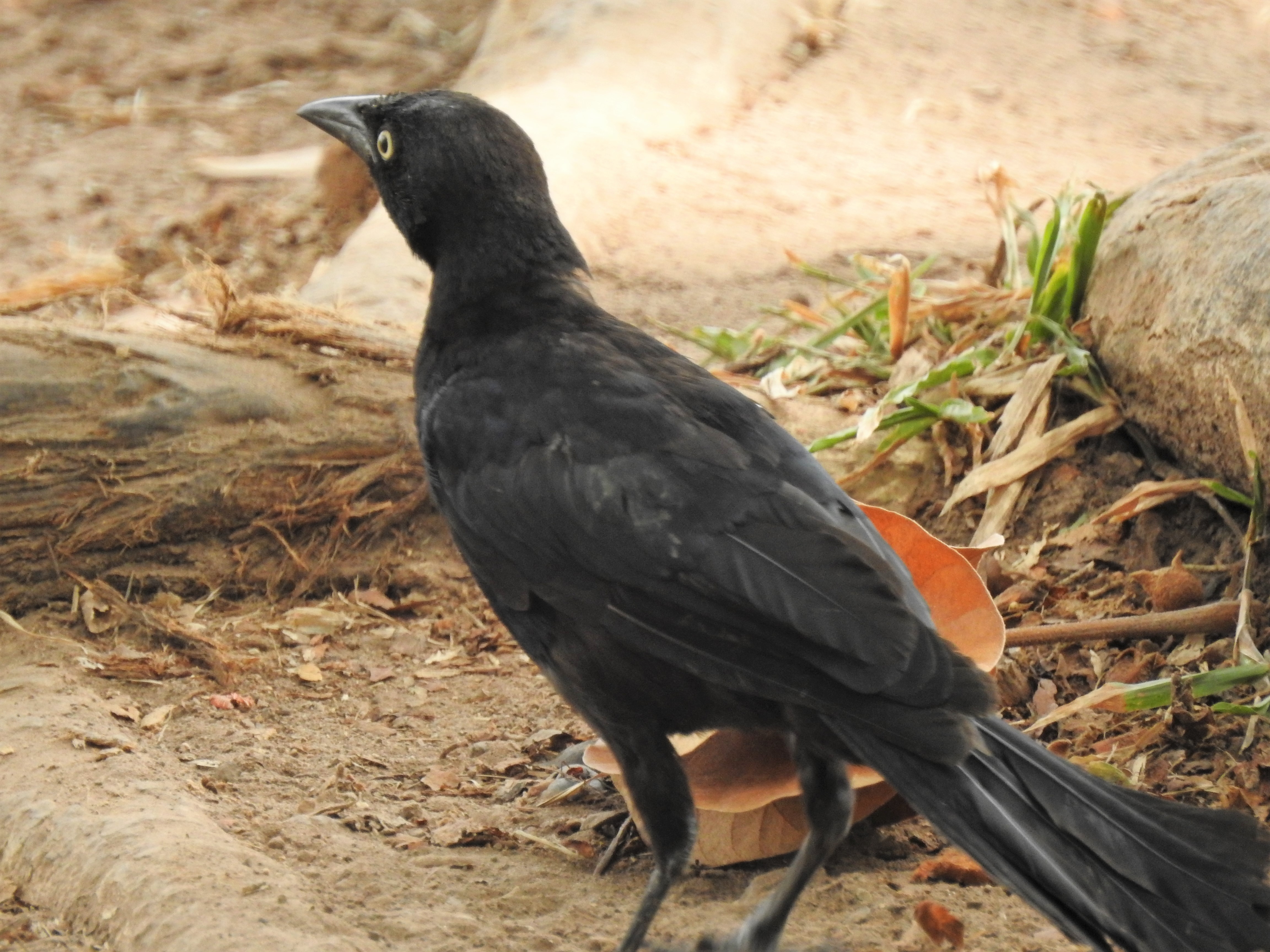 The male Greater Antillean Grackle is 11 inches long, glossy black with a large rudder-like tail; the 9.4 inches long female has a smaller tail and is similar in color but less glossy than the male. The eye is yellow and is the only non-black body part. The Greater Antillean Grackle will eat anything that can fit in its mouth. They eat fruits, bread, plant matter, and small vertebrates and invertebrates. [Wikipedia]