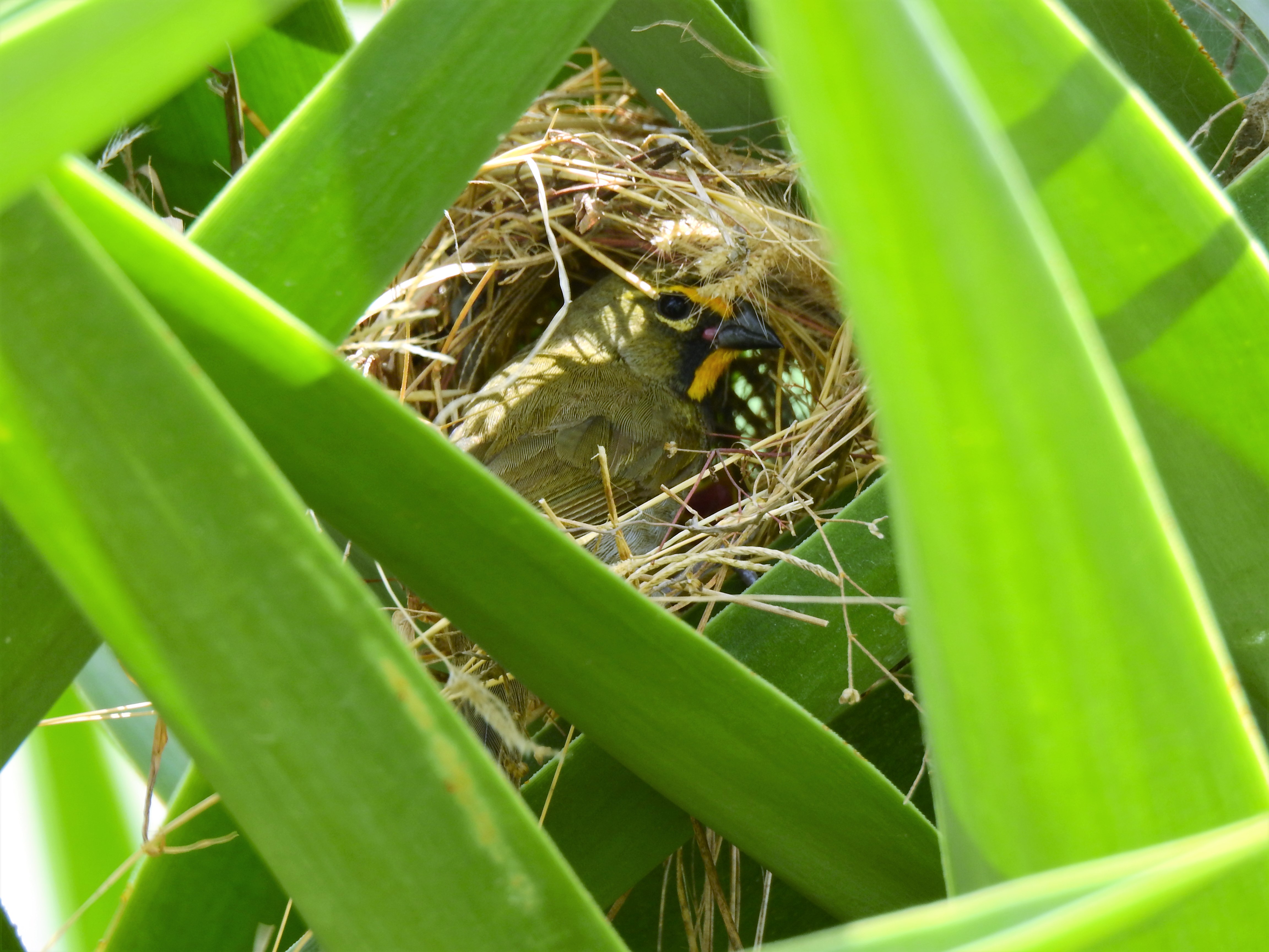 The Yellow-faced Grassquit (Tiaris olivaceus) is a small grayish-green finch that occurs from southeastern Mexico south to northern South America, and throughout the Greater Antilles. It is a common species that occurs in open grassy fields, pastures, roadsides, and clearings. Grassquits often travel in loose flocks, sometimes associating with other species, and primarily forage on grass seeds. Given the relative abundance and large geographic distribution, the conservation status of the Yellow-faced Grassquit is assessed as of “Least Concern.” [Neotropical Birds]