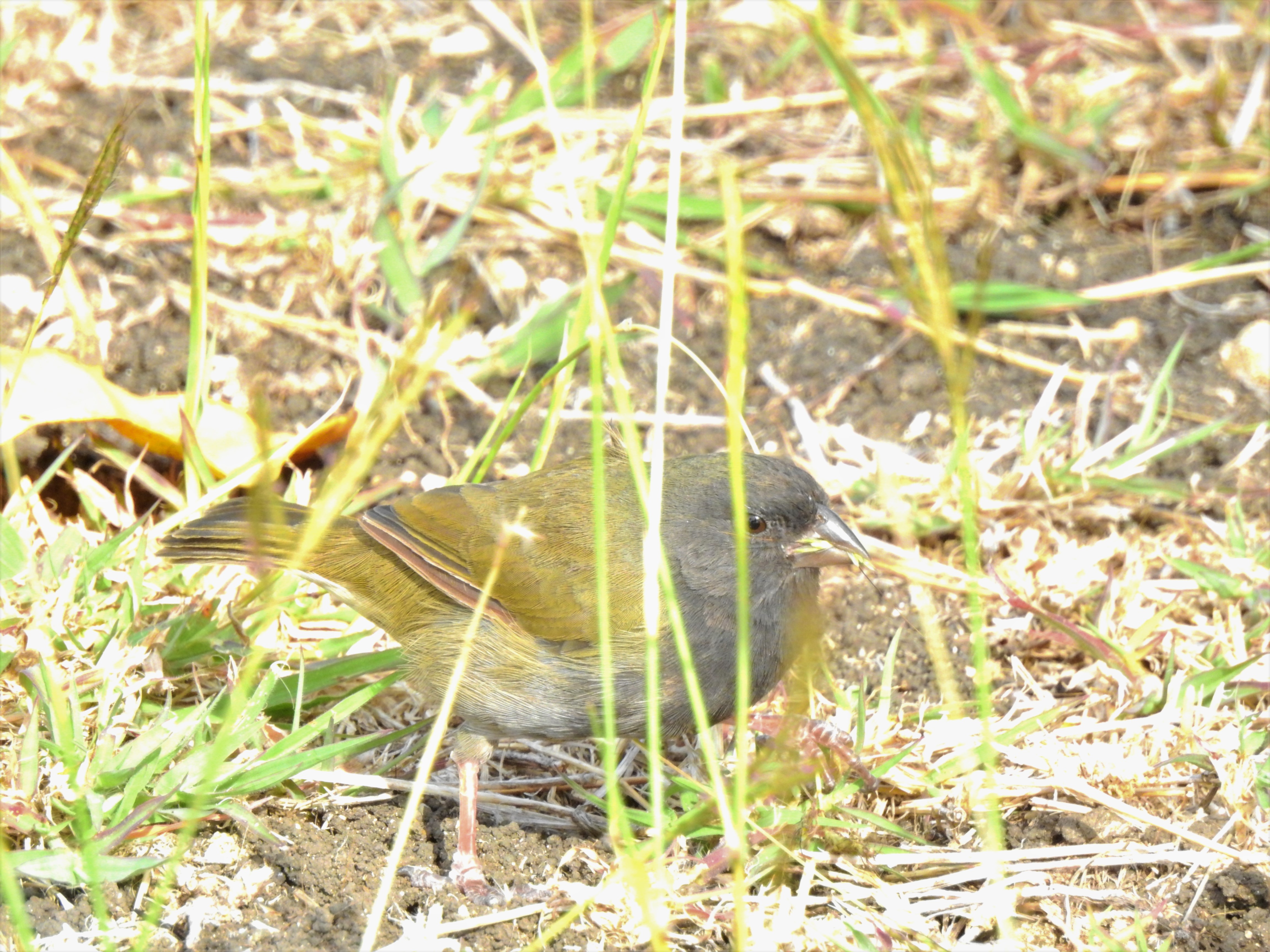 Black-face Grassquits specialize in eating grass seeds, and often forages in grassy lawns and fields. On smaller and lighter grasses, they may bend the seed head to the ground and forage on it in that manner. This niche of feeding on grass seeds while still on the stems is also used by Sporophila Seedeaters, and in the Old World by various Lonchura Mannikins. Interestingly enough some Black-faced Grassquits feed on cactus fruit in the Netherland Antilles, as do the Cactus-finches on the Galapagos. [Neotropical Birds]
