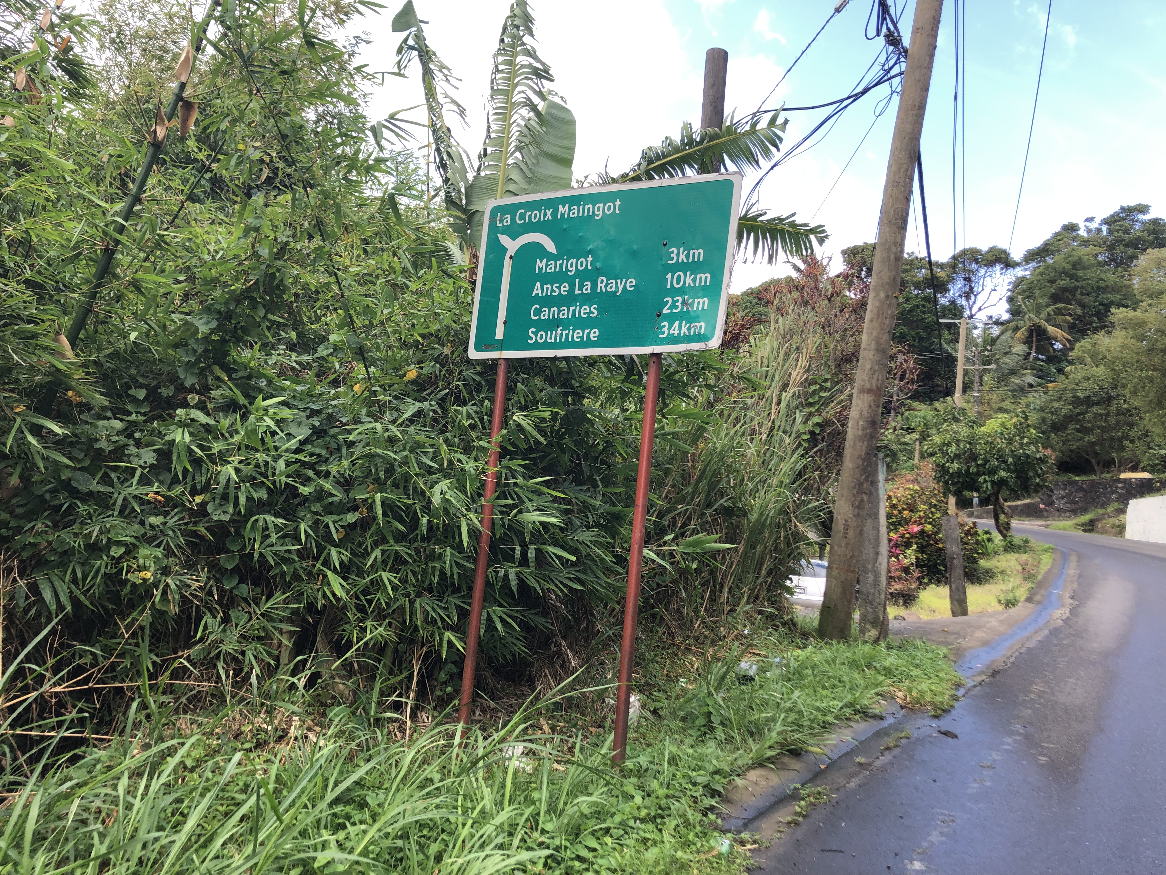 La Croix Maingot traffic sign in St. Lucia showing some of the more popular towns on the island.
