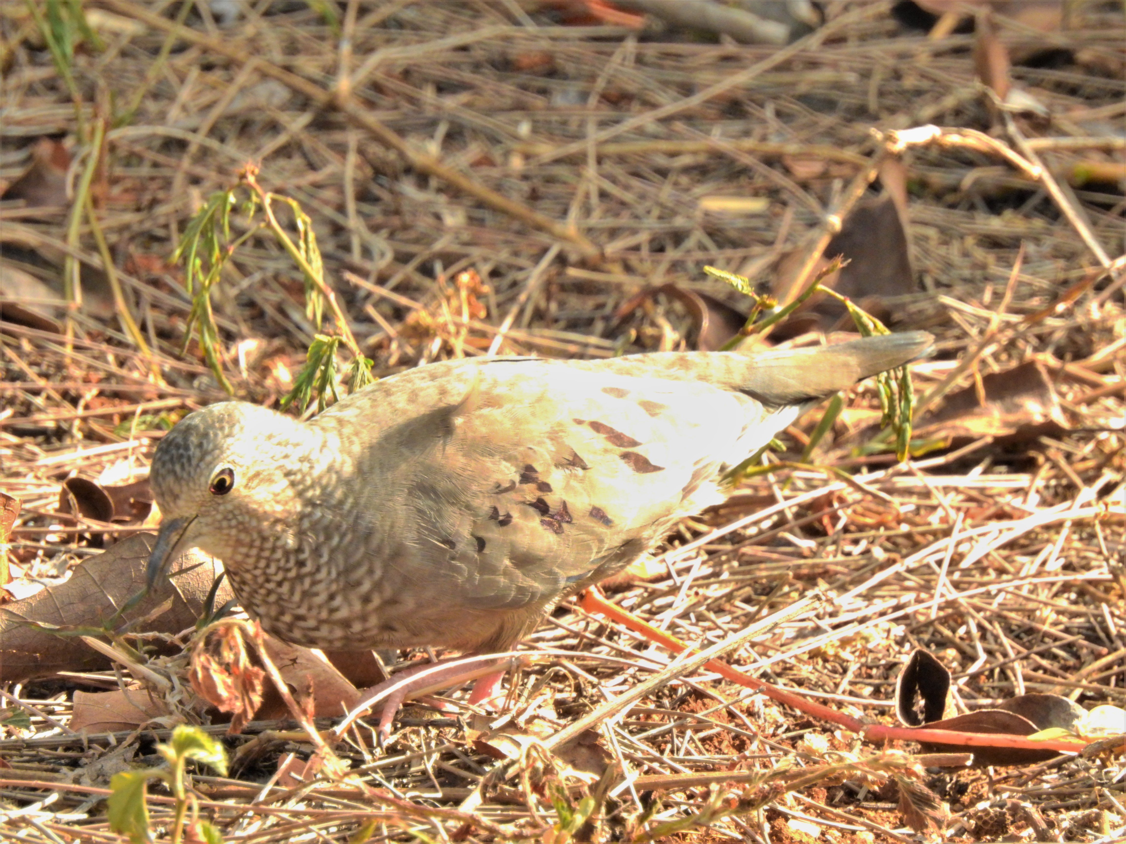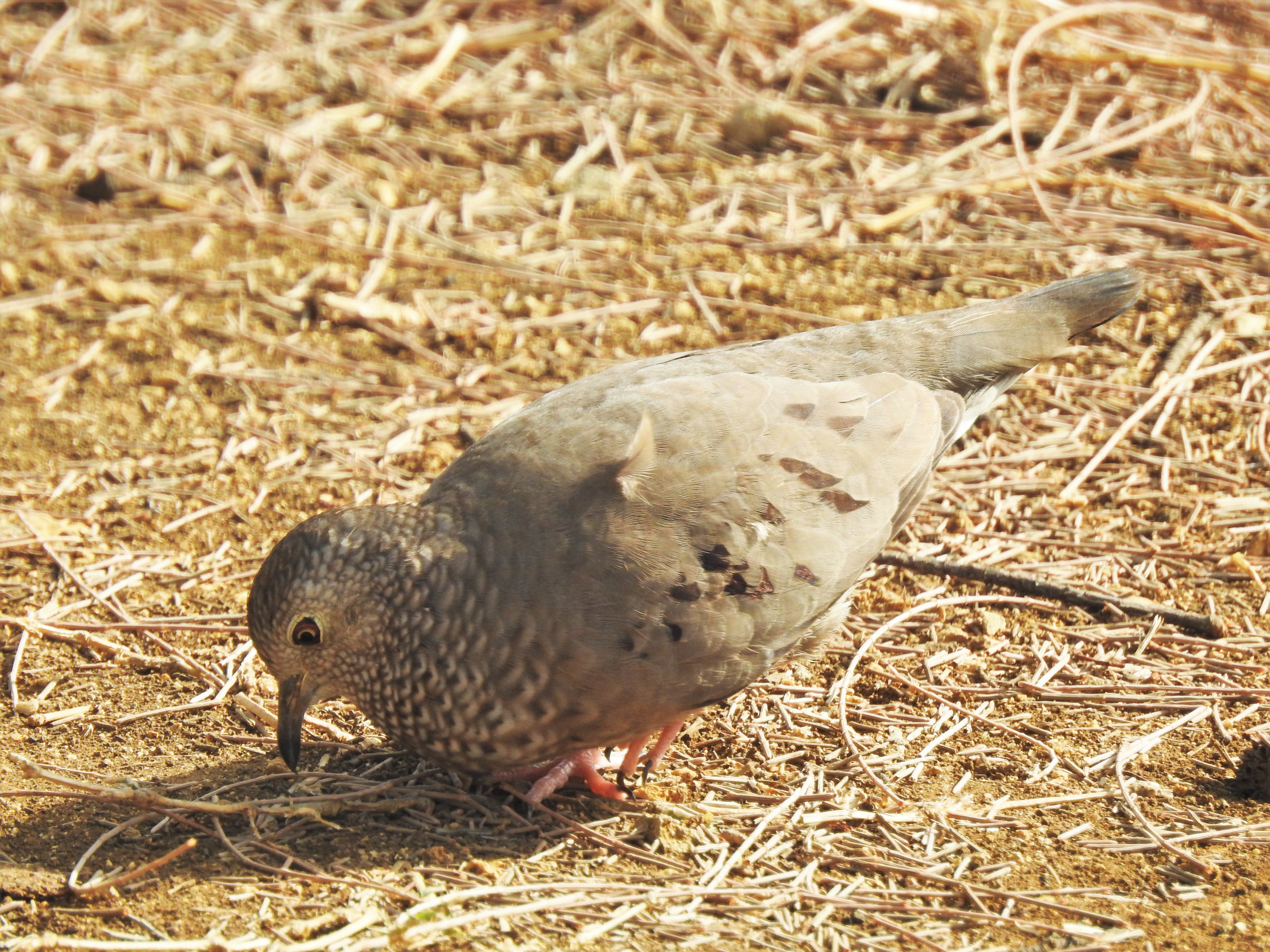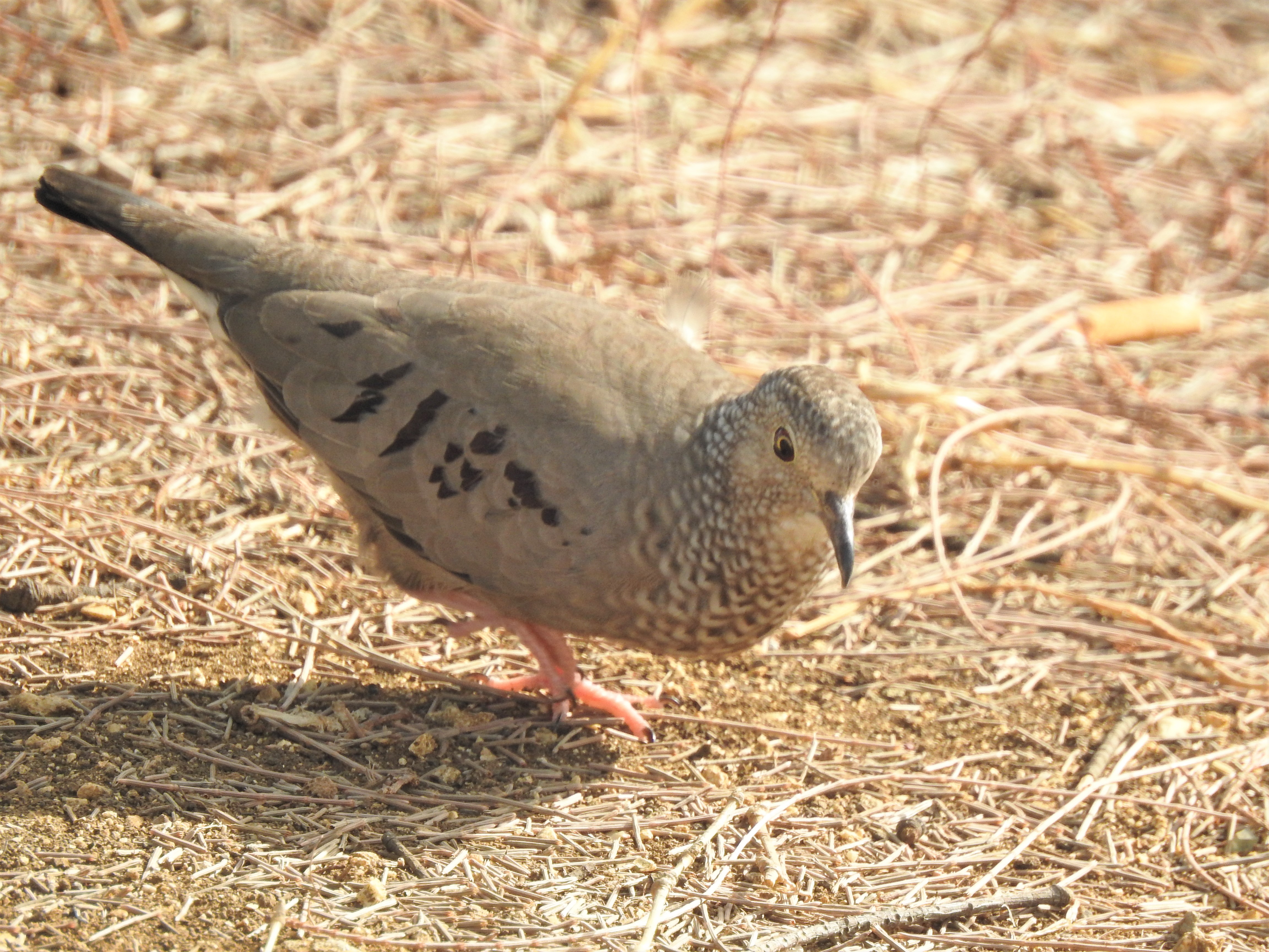 The Common Ground Dove is North America’s smallest dove and is one of the world’s smallest by mass. This species ranges from 15–18 cm (5.9–7.1 inches) in length, spans 27 cm (11 inches) across the wings and weighs 26–40 g (0.92–1.41 oz). The feathers on the head and the upper breast have a scale like appearance. The tail feathers are very short and similar color to the back. The plumage on the back of the bird is brown. The coverts and wing feathers are also brown but have black spotting on them. [Wikipedia]